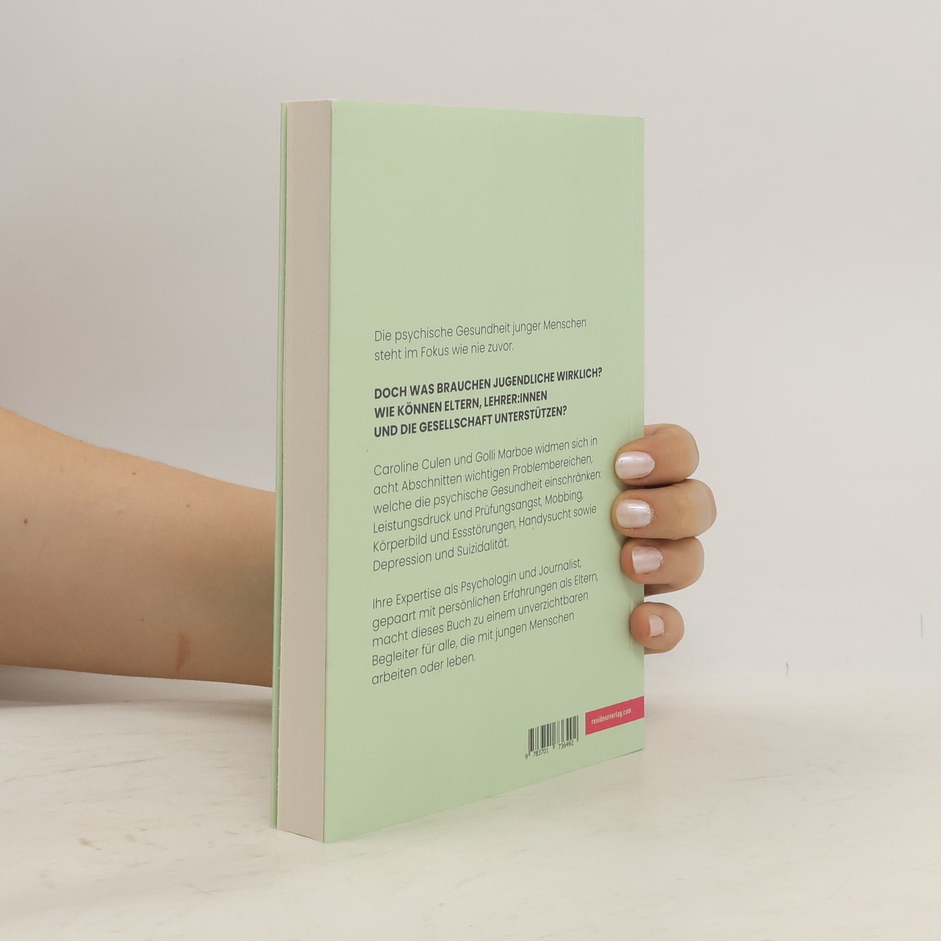 Caroline Culen und Golli Marboe widmen sich in zehn Abschnitten wichtigen Problembereichen, die die psychische Gesundheit junger Menschen einschränken, denn die neuesten Studien belegen, dass Kinder und Jugendliche anhaltend psychisch stark belastet sind. Diskussionen und Überlegungen rund um Mental Health haben in der letzten Zeit stark zugenommen. Dennoch ergeben sich viele Fragen und Unsicherheiten im Umgang mit betroffenen jungen Menschen. Sei es Leistungsdruck und Prüfungsangst oder Mobbing, Körperbild und Essstörungen, Handysucht, Depression, Suizidalität. Caroline Culen und Golli Marboe vermitteln Wissen rund um Mental Health. Sie berichten zur Veranschaulichung aus ihren beruflichen und persönlichen Erfahrungen und zeigen somit Wege im Umgang mit betroffenen jungen Menschen auf.