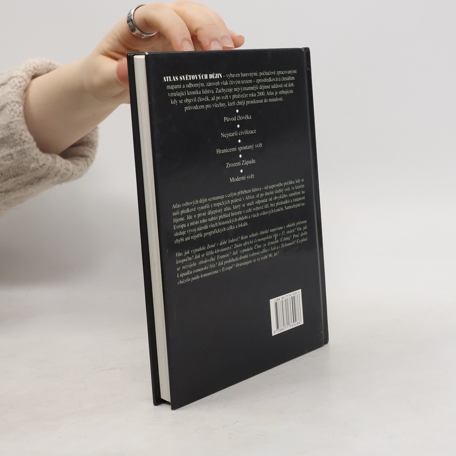 Atlas světových dějin seznamuje s celým příběhem lidstva - od naprostého počátku, kdy se naši předkové vynořili z tropických pralesů v Africe, až po dnešní složitý svět, ve kterém žijeme. Jde o první dějepisný atlas, který se snaží odpoutat od obvyklého zaměření na Evropu a místo toho nabízí přehled historie v celé světové říši, bez předsudků a zaujatosti sleduje vývoj národů všech historických období a všech světových končin. Samozřejmě nechybí ani rejstřík geografických celků a lokalit.