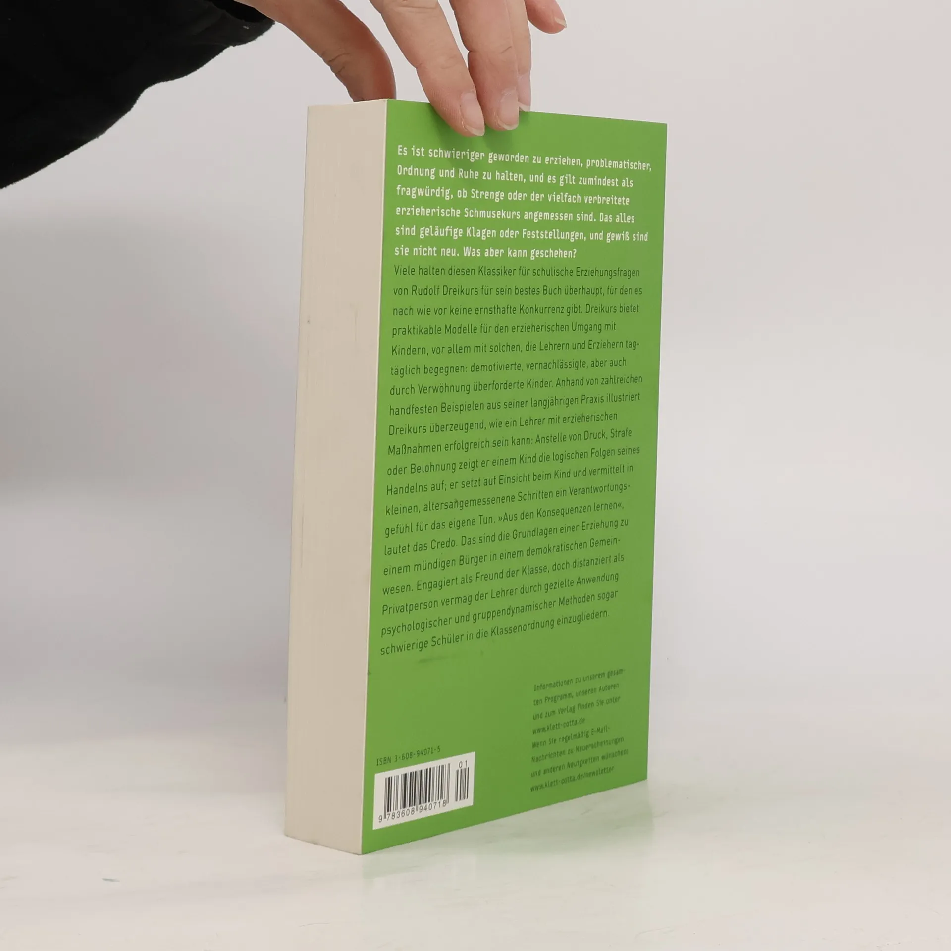 Viele halten diesen Klassiker für schulische Erziehungsfragen nach wie vor für Dreikurs' bestes Buch überhaupt, für das es keine ernsthafte Konkurrenz gibt. Dreikurs bietet praktikable Modelle für den erzieherischen Umgang mit Kindern, vor allem mit solchen, die Lehrern und Erziehern tagtäglich begegnen: demotivierte, vernachlässigte, aber auch durch Verwöhnung überforderte Kinder. Anhand zahlreicher Beispiele aus seiner langjährigen Praxis zeigt Dreikurs überzeugend, wie Lehrer mit erzieherischen Maßnahmen erfolgreich sein können: an die Stelle von Druck oder Belohnung treten besser die natürlich wirkenden, arrangierten logischen Folgen, die jedes Kind akzeptieren kann. »Aus den Konsequenzen lernen«, lautet das Credo. Engagiert als Freund der Klasse, doch distanziert als Privatperson vermag der Lehrer durch gezielte Anwendung psychologischer und gruppendynamischer Methoden sogar die schlimmsten Störenfriede in die Klassenordnung einzugliedern.