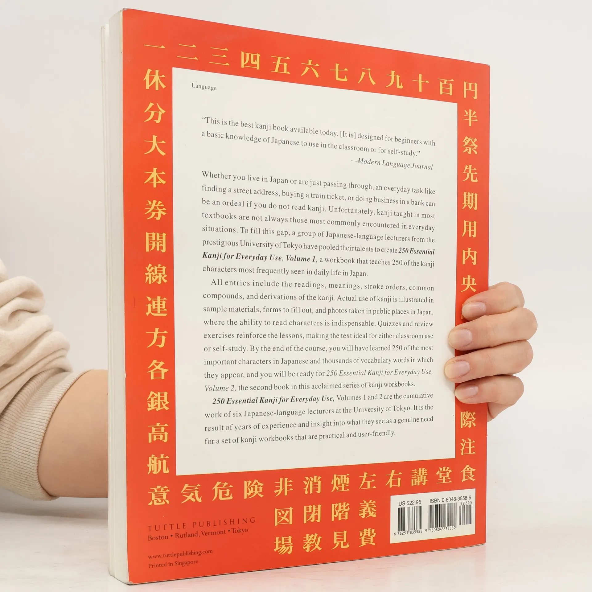 This book is indispensable for any non-native speaker trying to make it through a day in Japan. Covering 21 everyday situations, this book deals with a variety of topics ranging from the cordial ("How do you do?") to the crucial (Going to the hospital.) Fully illustrated with line drawings throughout, "250 Essential Kanji for Everyday Use Volume I offers valuable information for learners and visitors alike. As many classroom students can tell you, the kanji taught in most textbooks is not always encountered in everyday situations. To fill this gap, a group of researchers from the prestigious University of Tokyo pooled their talents to create "250 Essential Kanji for Everyday Use Volume I, a workbook that teaches the characters one is most likely to see in the day-to-day world. All entries include the meanings, stroke-orders, common compounds, and derivations of the kanji. Sample materials such as forms and public photos illustrate the actual use of kanji, showing the settings where a traveler or resident may come upon the characters. The quizzes and exercises fortify the lessons, making the text ideal for classroom use of self-study. By the end of the book, you will have learned the 250 most important characters in Japanese and thousands of vocabulary words in which they appear.