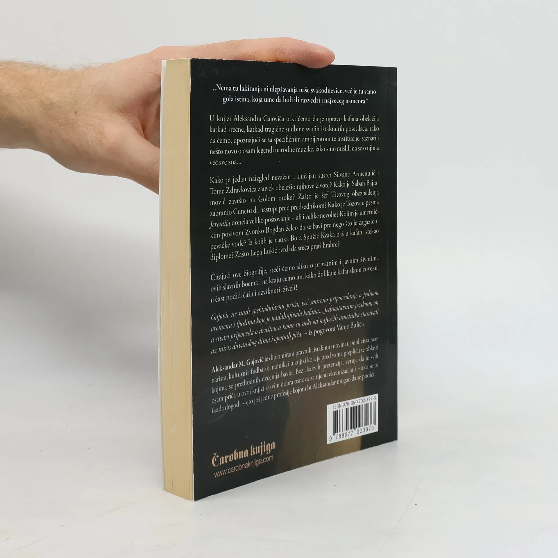 Životne priče legendarnih pevača kafanske boemije:Tome Zdravkovića,Šabana Bajramovića,Predraga Živkovića Tozovca,Cuneta Gojkovića,Silvane Armenulić,Lepe Lukić,Zvonka Bogdana,Bore Spužića Kvake.„Nema tu lakiranja ni ulepšavanja naše svakodnevice, već je tu samo gola istina, koja ume da boli ili razvedri i najvećeg namćora.“U knjizi Aleksandra Gajovića otkrićemo da je upravo kafana obeležila katkad srećne, katkad tragične sudbine svojih istaknutih posetilaca, tako da ćemo, upoznajući se sa specifičnim ambijentom te institucije, saznati i nešto novo o osam legendi narodne muzike, iako smo mislili da se o njima već sve zna…Kako je jedan naizgled nevažan i slučajan susret Silvane Armenulić i Tome Zdravkovića zauvek obeležio njihove živote? Kako je Šaban Bajramović završio na Golom otoku? Zašto je šef Titovog obezbeđenja zabranio Cunetu da nastupi pred predsednikom? Kako je Tozovcu pesma Jeremija donela veliko poštovanje – ali i velike nevolje?Kojim je umetničkim pozivom Zvonko Bogdan želeo da se bavi pre nego što je zagazio u pevačke vode? Iz kojih je nauka Bora Spužić Kvaka baš u kafani stekao diplome? Zašto Lepa Lukić tvrdi da sreća prati hrabre?Čitajući ove biografije, steći ćemo sliku o privatnim i javnim životima ovih slavnih boema i na kraju ćemo im, kako dolikuje kafanskom čoveku, u čast podići čašu i uzviknuti: živeli!„Gajović ne nudi spektakularnu priču, već smireno pripovedanje o jednom vremenu i ljudima koje je nadahnjivala kafana... Jednostavnim jezikom, on u stvari pripoveda o društvu u kome su neki od najvećih umetnika stasavali uz miris duvanskog dima i opojnih pića.“Iz pogovora Vanje BulićaAleksandar M. Gajović je diplomirani pravnik, istaknuti novinar, publicista, scenarista, kulturni i fudbalski radnik, i u knjizi koja je pred vama prepliću se oblasti kojima se prethodnih decenija bavio. Bez ikakvih pretenzija, veruje da je svih osam priča u ovoj knjizi sasvim dobra osnova za njenu ekranizaciju i – ako se to ikada dogodi – eto još jedne profesije kojom bi Aleksandar mogao da se podiči.