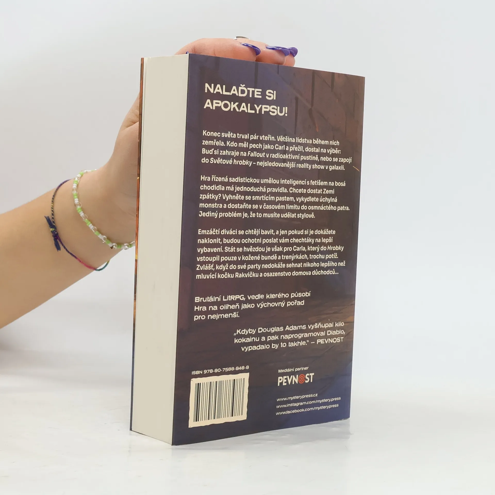 Konec světa trval pár sekund. Většina lidstva během nich zemřela. Kdo měl pech jako Carl a přežil, dostal na výběr: Buď si zahraje na Fallout v radioaktivní pustině, nebo se zapojí do Hrobky – nejsledovanější reality show v galaxii. Hra řízená Taťkou, sadistickou umělou inteligencí s fetišem na bosá chodidla, má jednoduchá pravidla. Chcete dostat Zemi zpátky? Vyhněte se brutálním pastem, vykydlete úchylná monstra a dostaňte se v časovém limitu do osmnáctého levelu. Jediný problém je, že to musíte udělat stylově. Emzáčtí diváci se chtějí bavit, a jen pokud si je dokážete naklonit, budou ochotni poslat vám chechtáky na lepší vybavení. Stát se hvězdou je však pro Carla, který do Hrobky vstoupil v kožené bundě a trenýrkách, trochu potíž. Zvlášť, když do své party nedokáže sehnat nikoho lepšího než mluvicí kočku Rakvičku a osazenstvo domova důchodců…