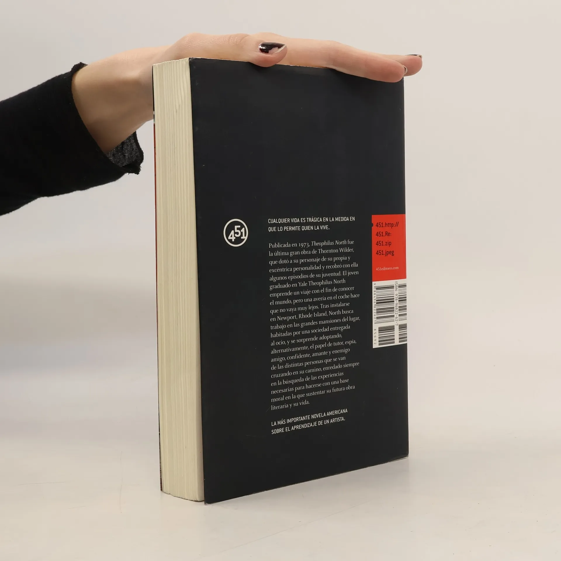 "Cualquier vida es trágica en la medida en que lo permite quien la vive. Publicada en 1973, Theophilus North fue la última gran obra de Thornton Wilder, que dotó a su personaje de su propia y excéntrica personalidad y recobró con ella algunos episodios de su juventud. El joven graduado en Yale Teophilus North emprende un viaje con el fin de conocer el mundo, pero una avería en el coche hace que no vaya muy lejos. Tras instalarse en Newport, Rhode Island, North busca trabajo en las grandes mansiones del lugar, habitadas por una sociedad entregada al ocio, y se sorprende adoptando, alternativamente, el papel de tutor, espía, amigo, confidente, amante y enemigo de las distintas personas que se van cruzando en su camino, enredado siempre en la búsqueda de las experiencias necesarias para hacerse con una base moral en la que sustentar su futura obra literaria y su vida."