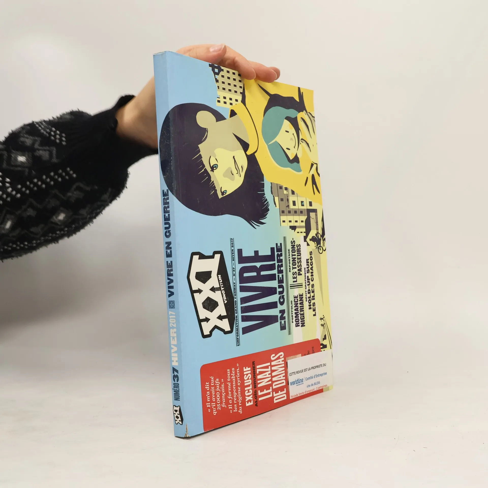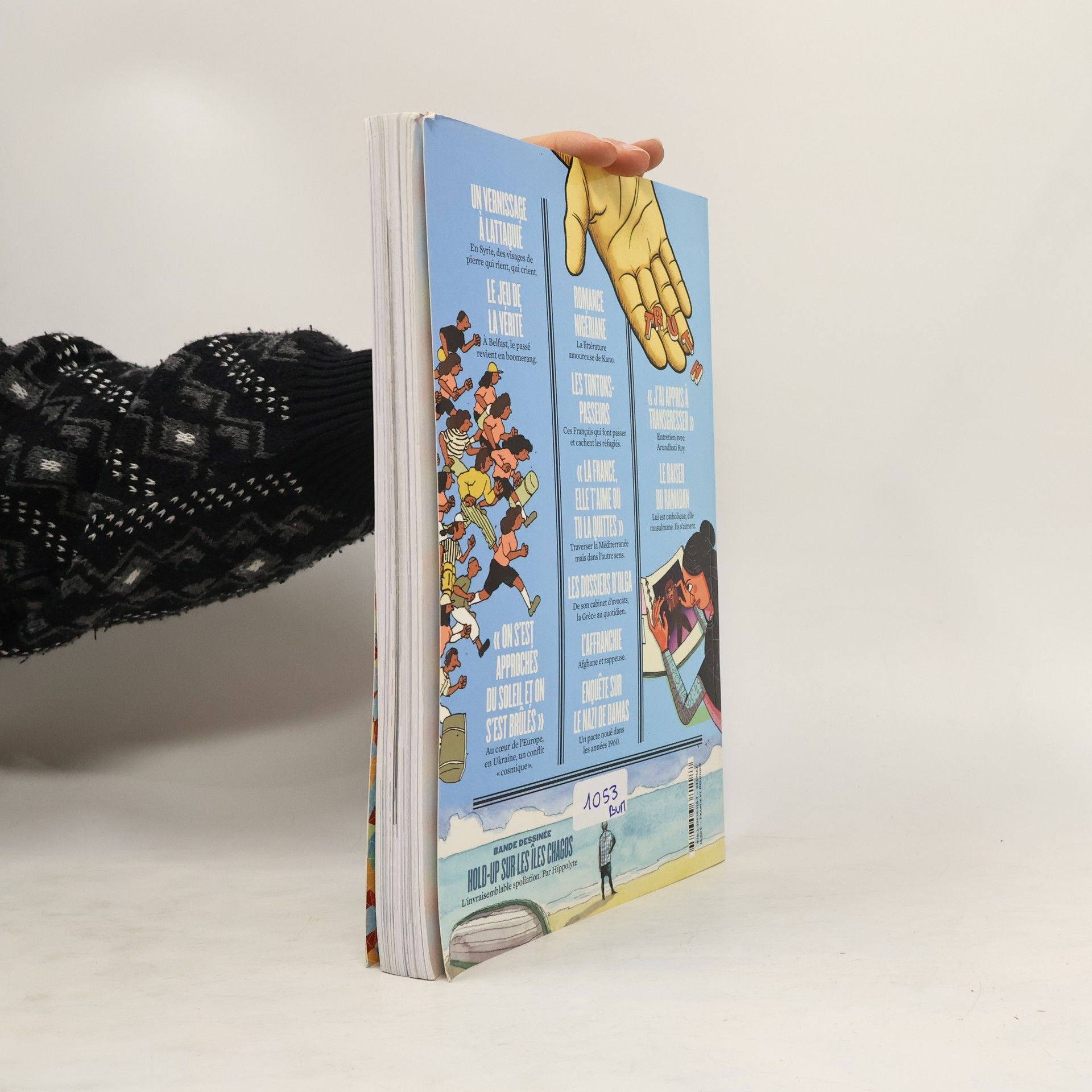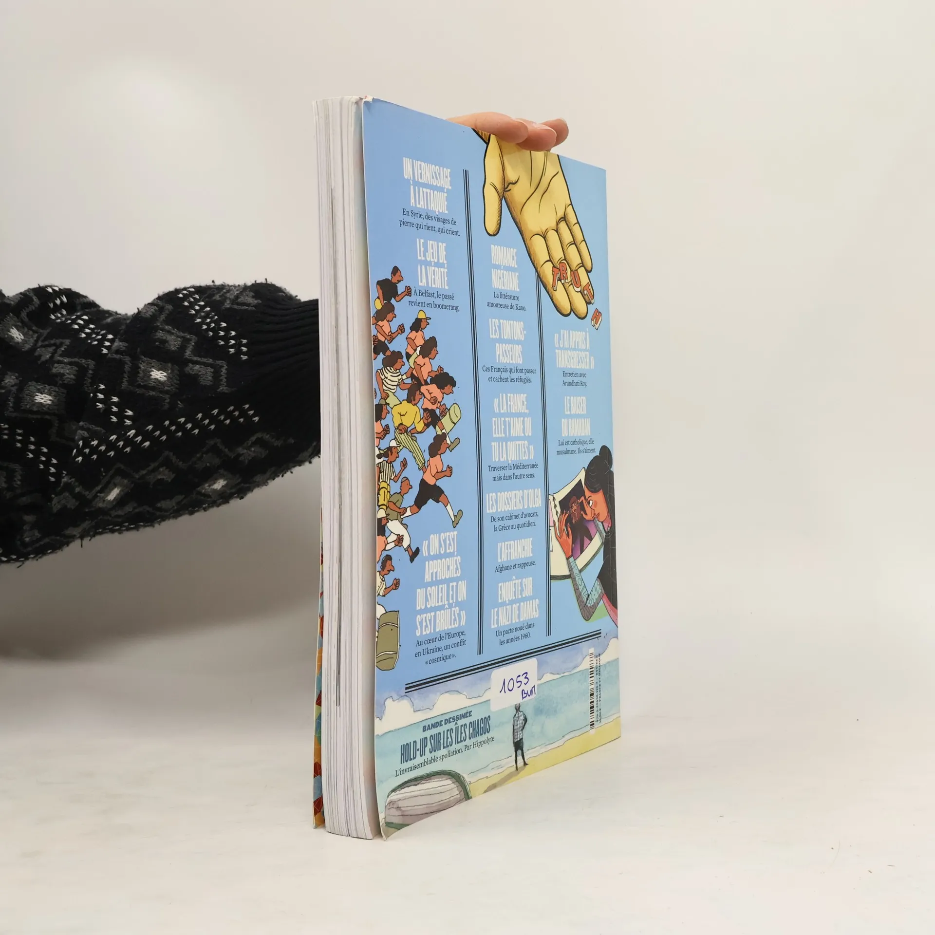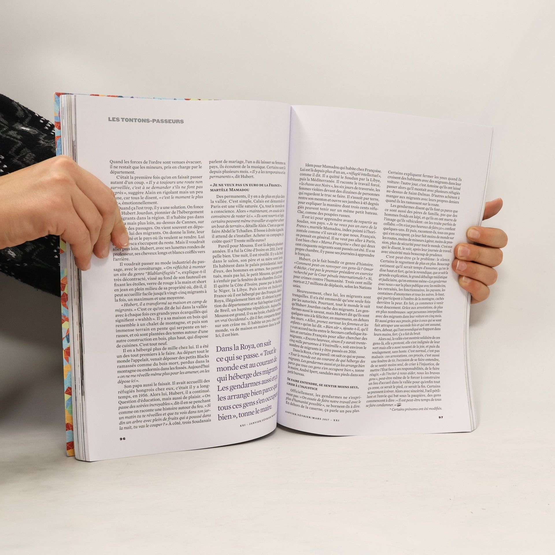 DOSSIER VIVRE EN GUERRE On s'est approches du soleil et on s'est brules A Donesk, l'ecrivain Fiodor Berezine a quitte ses batailles cosmiques pour un vrai champ de bataille.Par Marion QuillardUn vernissage a LattaquieNizar Ali Badr chronique la guerre avec des galets, et expose ses visages de pierre.Par Adeline Chenon RamlatLe jeu de la veriteEn Irlande du Nord, le passe revient en boomerang.Par Fabienne Lips-DumasEGALEMENT AU SOMMAIRE: Reportage Photo Romance NigerianeA Kano, les femmes se sont lancees dans la litterature romantique.Par Glenna GordonLes tontons-passeursDans la vallee de la Roya, des Francais font passer et cachent des refugies.Par Thibault Petit La France, elle t'aime ou tu la quittes Francais de parents algeriens, ils traversent la Mediterranee dans l'autre sens.Par Victor Castanet et Yael GoujonLes dossiers d'OlgaAvocate a Thessalonique, elle mesure le courage de ses clients.Par Helene DesplanquesDocumentaire: L'AffranchieSonita, Afghane devenue rappeuse aux Etats-Unis.Par Rokhsareh Ghaem MaghamiEntretien Arundhati RoyCette femme engagee interroge tous les dogmes.Par Eve CharrinRecit graphique Main basses sur les iles ChagosUn invraisemblable hold-up au milieu de l'ocean Indien.Par Hippolyte et Morgan FacheVecu Le baiser du RamadanIls s'aiment, veulent se marier. Lui est catholique, elle musulmane.Par Myriam Blal