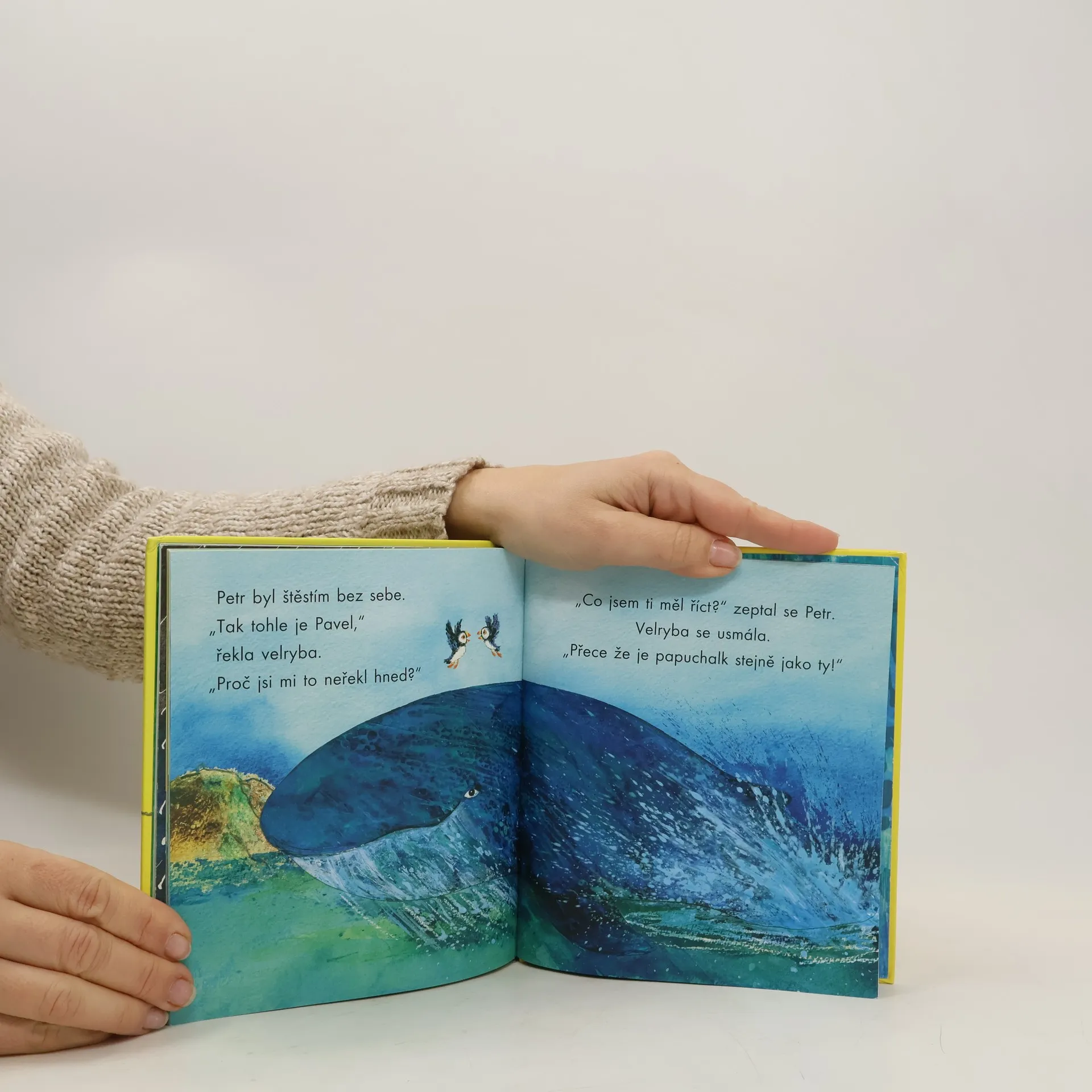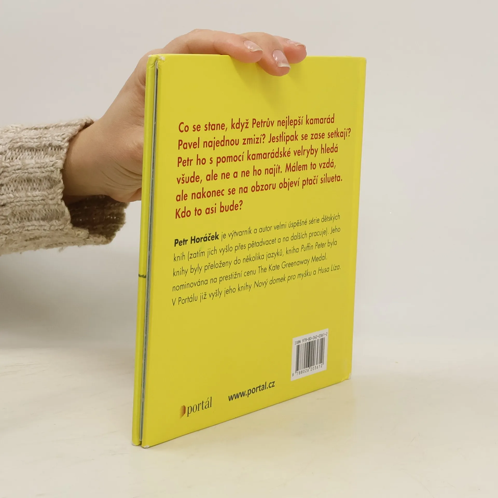 Co se stane, když Petrův nejlepší kamarád Pavel najednou zmizí? Jestlipak se zase setkají? Petr ho s pomocí kamarádské velryby hledá všude, ale ne a ne ho najít. Málem to vzdá, ale nakonec se na obzoru objeví ptačí silueta. Kdo to asi bude? Petr Horáček je výtvarník a autor velmi úspěšné série dětských knih (zatím jich vyšlo přes pětadvacet a na dalších pracuje). Jeho knihy byly přeloženy do několika jazyků, kniha Puffin Peter byla nominována na prestižní cenu The Kate Greenaway Medal. V Portálu již vyšly jeho knihy Nový domek pro myšku a Husa Líza.