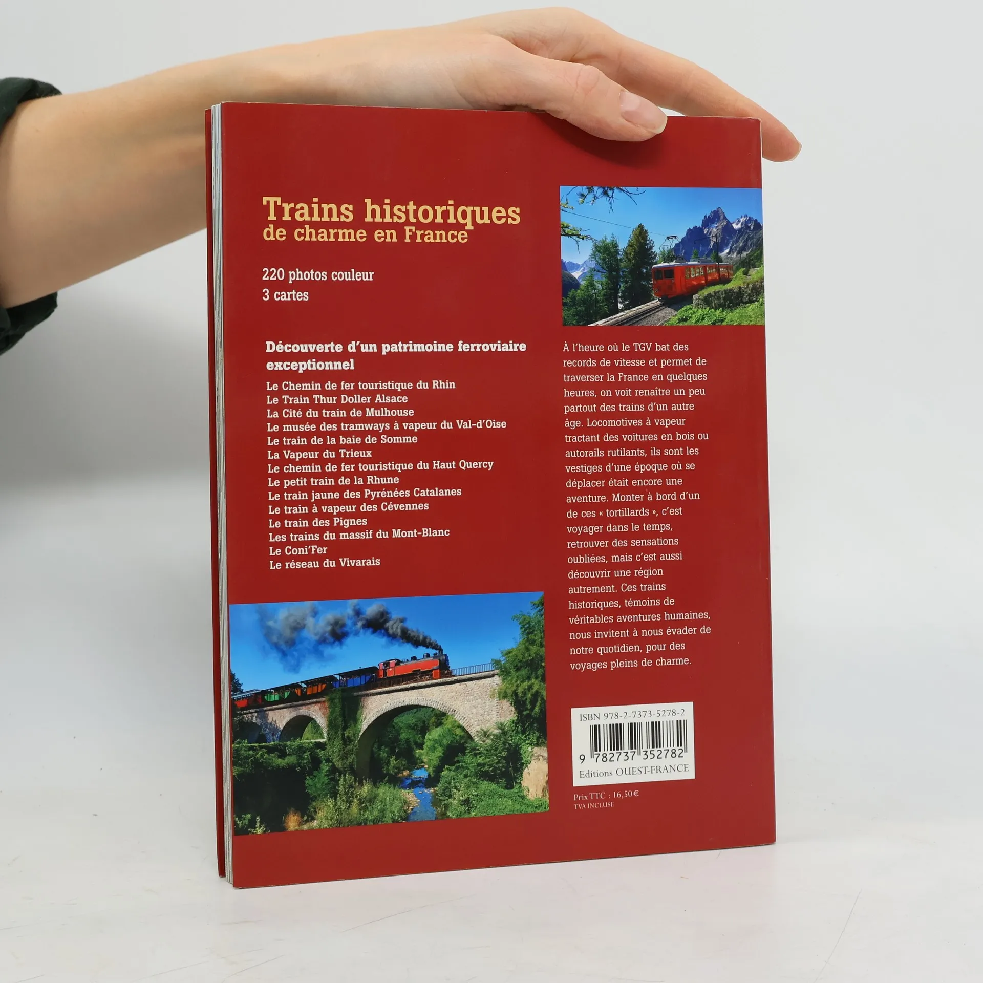 - Autorails surannés, locomotives à vapeur fumantes, T.E.R. sauvés du démantèlement, les trains touristiques et historiques sont avant tout des aventures humaines que chacun peut partager, le temps d’une balade dans quelques-uns des plus beaux paysages de France. - Des trois trains du massif du Mont-Blanc au train jaune des Pyrénées Catalanes, du train de la baie de Somme au Vapeur du Trieux, partez à la découverte de 15 trains historiques et visitez des musées consacrés à l'histoire ferroviaire. En couverture : le Train à Vapeur des Cévennes En pièce jointe : la liste des trains touristiques présentés dans l'ouvrage