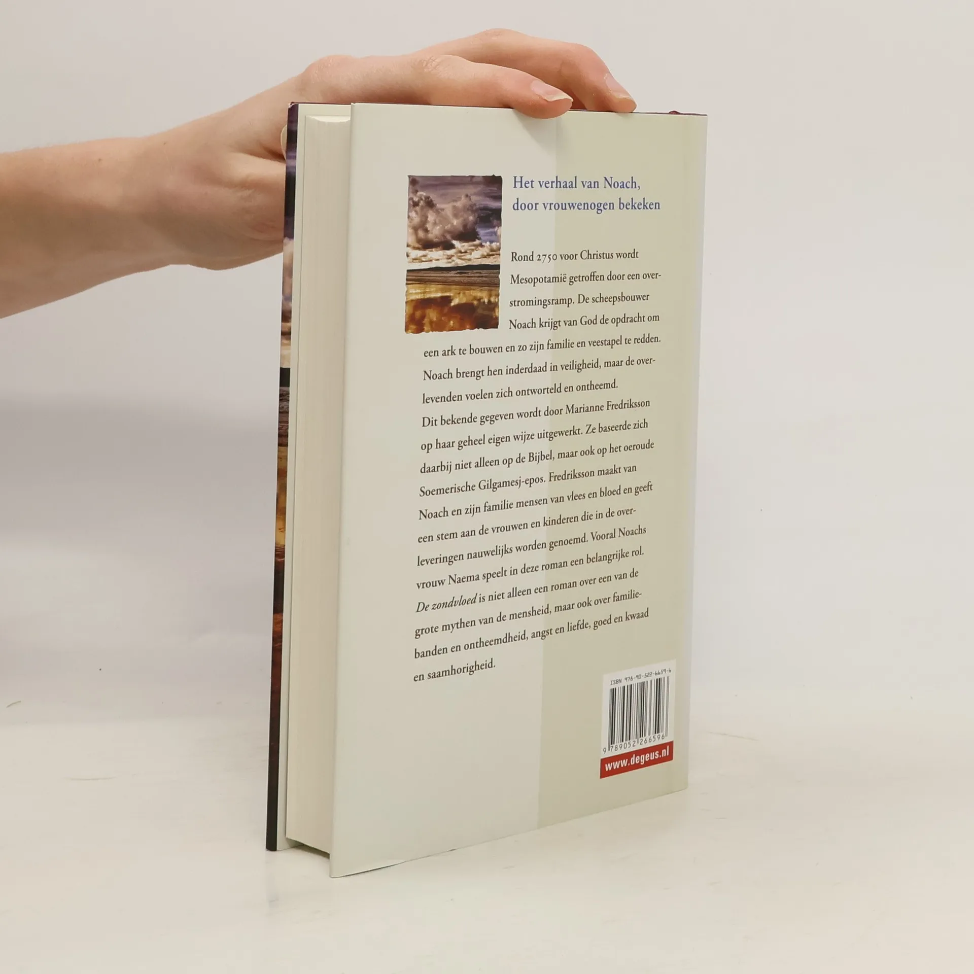 Rond 2750 voor Christus wordt Mesopotamië getroffen door een overstromingsramp. De scheepsbouwer Noach krijgt van God de opdracht om een ark te bouwen en zo zijn familie en veestapel te redden. Noach brengt hen inderdaad in veiligheid, maar de overlevenden voelen zich ontworteld en ontheemd. Dit bekende gegeven wordt door Marianne Fredriksson op haar geheel eigen wijze uitgewerkt. Ze baseerde zich daarbij niet alleen op de Bijbel, maar ook op het oeroude Soemerische Gilgamesj-epos. Fredriksson maakt van Noach en zijn familie mensen van vlees en bloed en geeft een stem aan de vrouwen en kinderen die in de overleveringen nauwelijks worden genoemd. Vooral Noachs vrouw Naema speelt in deze roman een belangrijke rol. De zondvloed is niet alleen een roman over een van de grote mythen van de mensheid, maar ook over familiebanden en ontheemdheid, angst en liefde, goed en kwaad en saamhorigheid. © degeus.nl