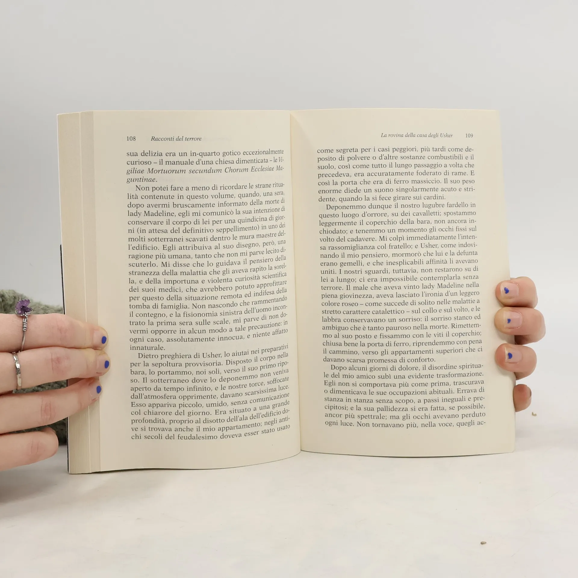 Segrete di castelli e case in rovina, cadaveri in putrefazione e persone sepolte vive… Utilizzando tutto l'armamentario gotico, Edgar Allan Poe scopre in realtà la disgregazione della psiche e rivela l'angoscia esistenziale. La paura si declina in vari gradi: da quello immediato, esteriore, all'ansia scaturita dall'incerto altalenare tra la vita e la morte, al terrore del sepolto vivo. Questi e molti altri aspetti si intrecciano nella produzione di Poe, narratore dell'assurdo e dell'orrore, precursore degli effetti surreali e geniale anticipatore della narrativa combinatoria: racconti brevi, e davvero ipnotici, che si impossessano dell'anima di chi li legge.