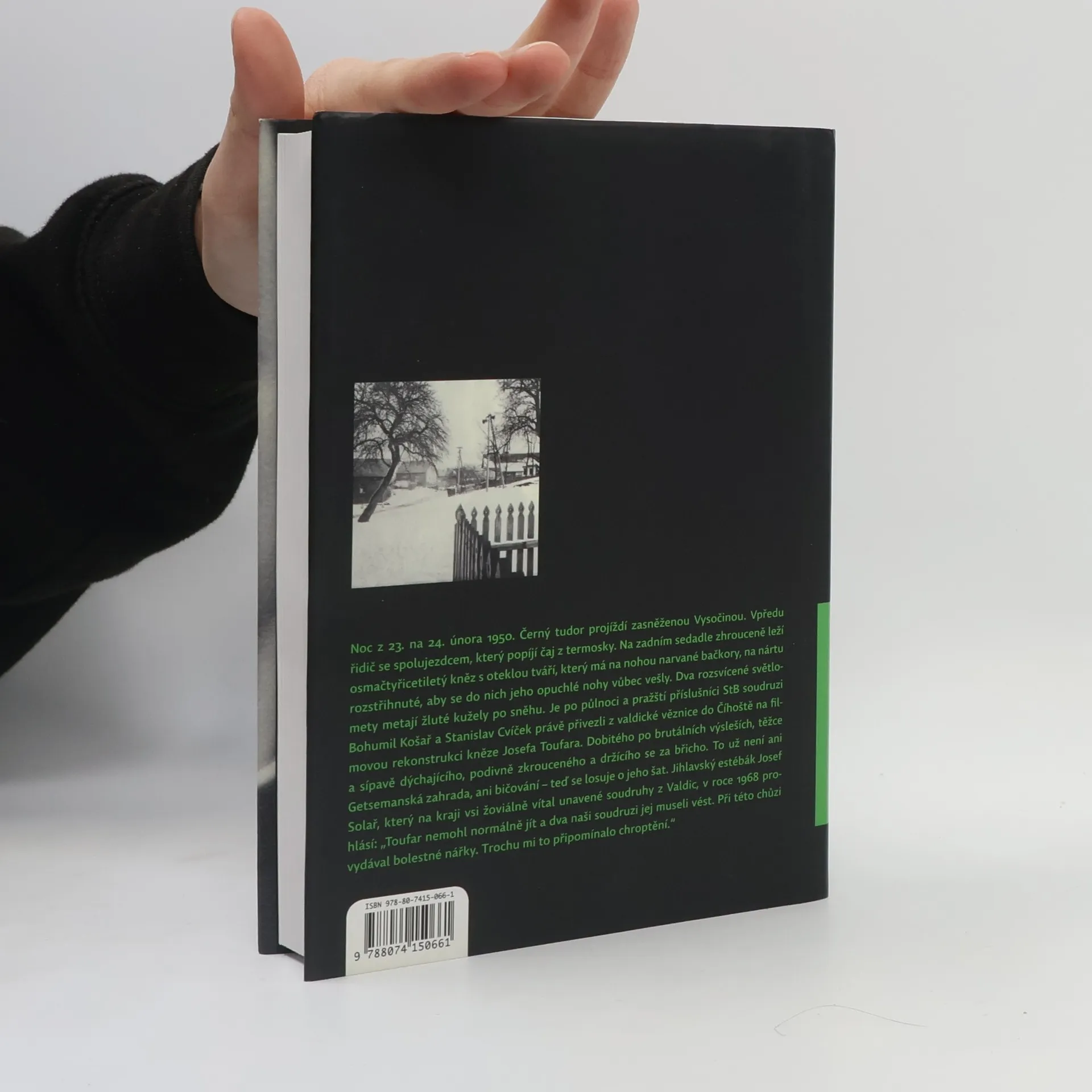 Noc z 23. na 24. února 1950 se odehrává v zasněžené Vysočině, kde se v černém tudoru nachází osmačtyřicetiletý kněz P. Josef Toufar, zbitý a unesený příslušníky StB. Po brutálních výsleších je přivezen na filmovou rekonstrukci, přičemž jeho stav je alarmující. V adventu 1949, během kázání, se v kostele v Číhošti zakýval oltářní křížek, což vidělo dvacet svědků. Po tomto incidentu byl Toufar zatčen a mučením donucen k lživému přiznání. Jeho mučednická smrt zhatila plánovaný monstrproces, avšak nebránila dalším útokům komunistického režimu na katolickou církev. Autor se rozhodl prozkoumat nejen poslední události, ale i Toufarův život, jeho původ, motivaci stát se knězem a cestu k vysvěcení. Shromáždil dokumenty, fotografie a svědectví, aby vytvořil komplexní portrét, který není jen historickým pojednáním, ale i osobním a humorným pohledem na životní příběh. Kniha obsahuje textovou a obrazovou část, která zachycuje historii Vysočiny v první polovině 20. století, včetně míst zasažených komunistickými zásahy. Autor, Miloš Doležal, se snaží vrátit regionu jeho paměť a připomenout hrdiny a mučedníky této doby.