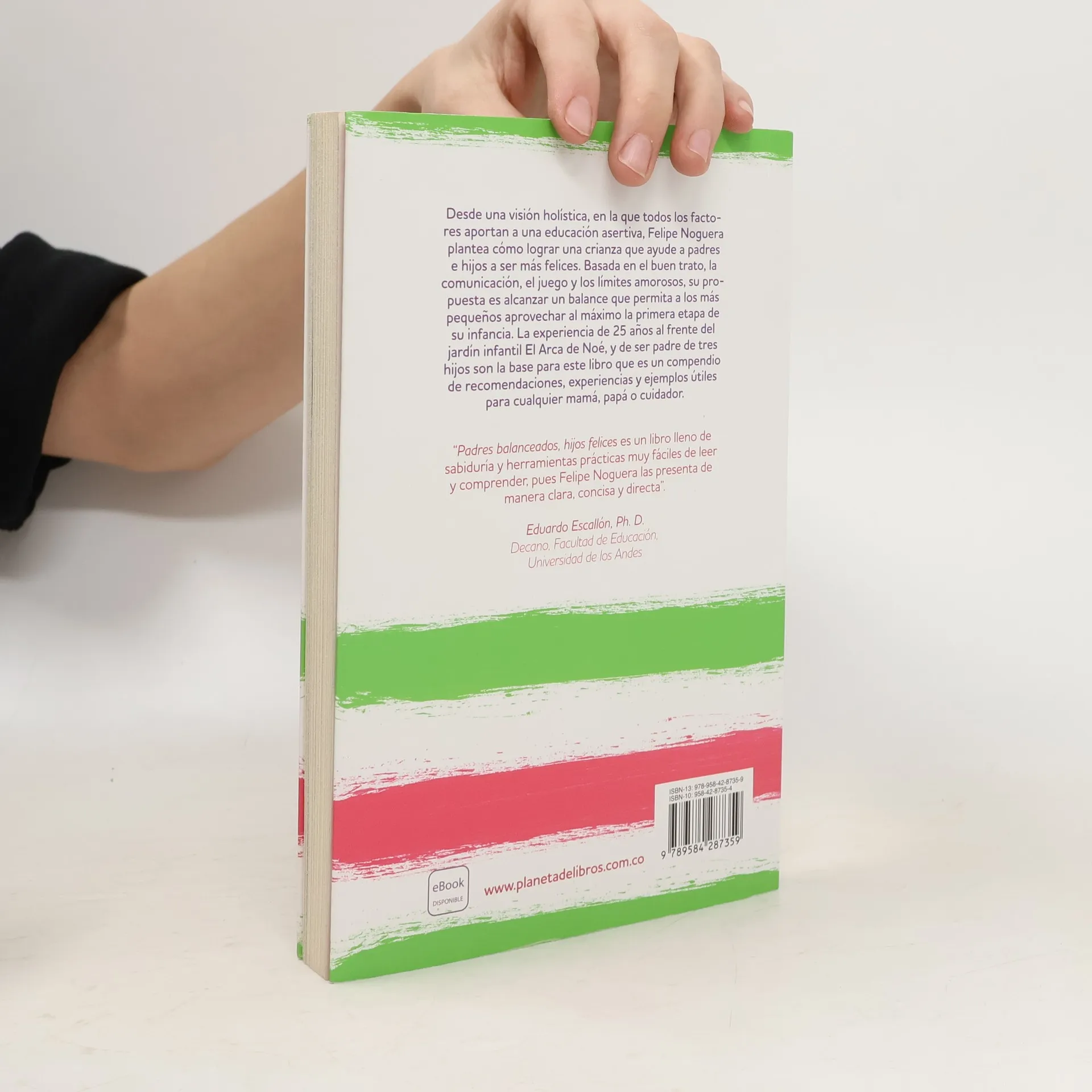 Desde una visión holística, en la que todos los factores aportan a una educación asertiva, Felipe Noguera plantea cómo lograr una crianza que ayude a padres e hijos a ser más felices. Basada en el buen trato, la comunicación, el juego y los límites amorosos, su propuesta es alcanzar un balance que permita a los más pequeños aprovechar al máximo la primera etapa de su infancia. La experiencia de 25 años al frente del jardín infantil El Arca de Noé, y de ser padre de tres hijos son la base para este libro que es un compendio de recomendaciones, experiencias y ejemplos, útiles para cualquier mamá, papá o cuidador. " Padres balanceados, hijos felices es un libro lleno de sabiduría y herramientas prácticas muy fáciles de leer y comprender, pues Felipe Noguera las presenta de manera clara, concisa y directa". Eduardo Escallón, Ph. D. Decano, Facultad de Educación, Universidad de los Andes