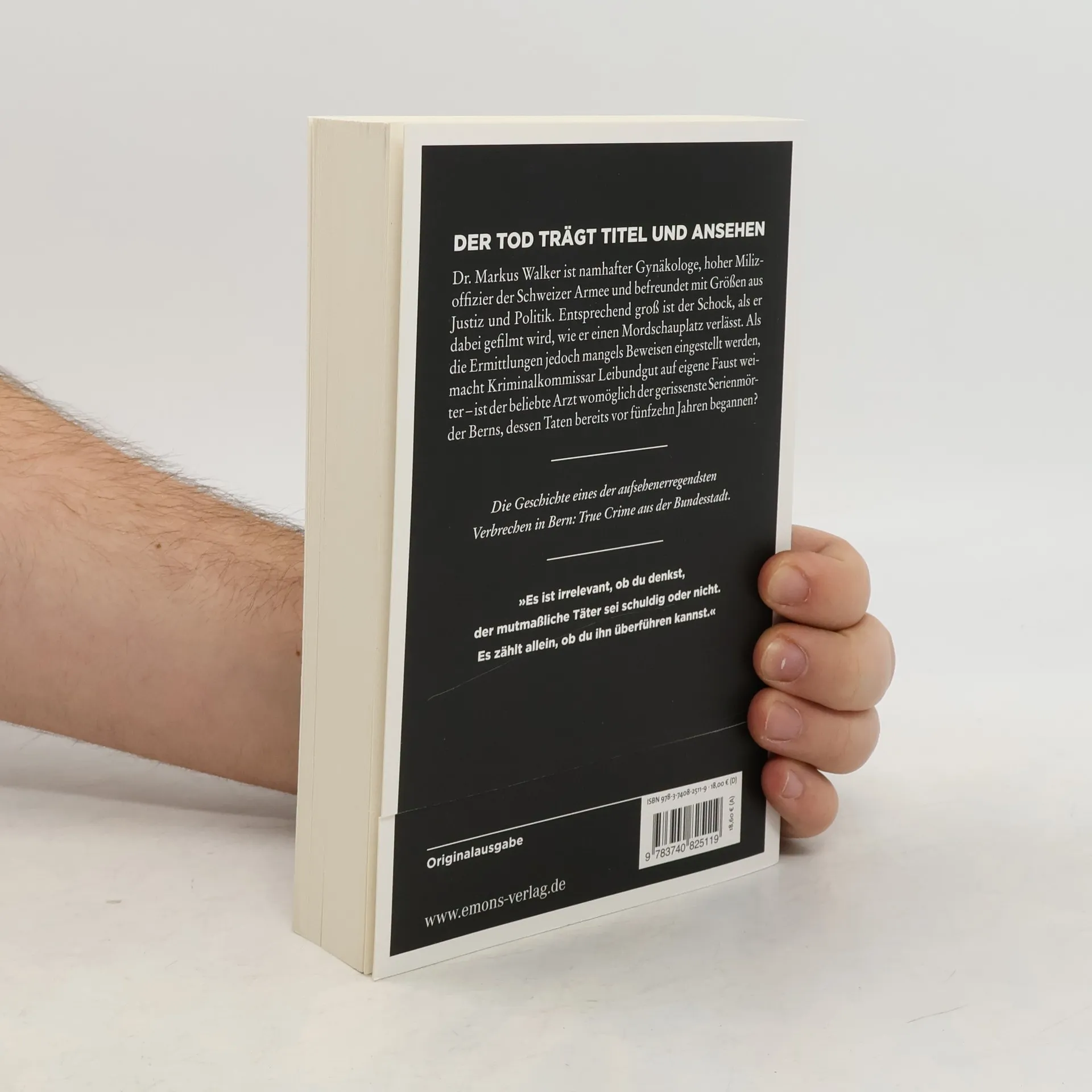 Der mörderische Biedermann aus Bern Die fiktive Geschichte eines wahren Falls: True Crime aus der Bundesstadt. Dr. Markus Walker ist namhafter Gynäkologe, hoher Milizoffizier der Schweizer Armee und befreundet mit Größen aus Justiz und Politik. Als ein Mann tot aufgefunden wird, traut die Polizei bei der Sichtung der Videoüberwachung ihren Augen nicht: Dr. Walker verlässt den Tatort. Als jedoch die Ermittlungen eingestellt werden, macht Kriminalkommissar Leibundgut auf eigene Faust weiter – ist der beliebte Arzt womöglich der gerissenste Serienmörder Berns, dessen Taten bereits vor 15 Jahren begannen?