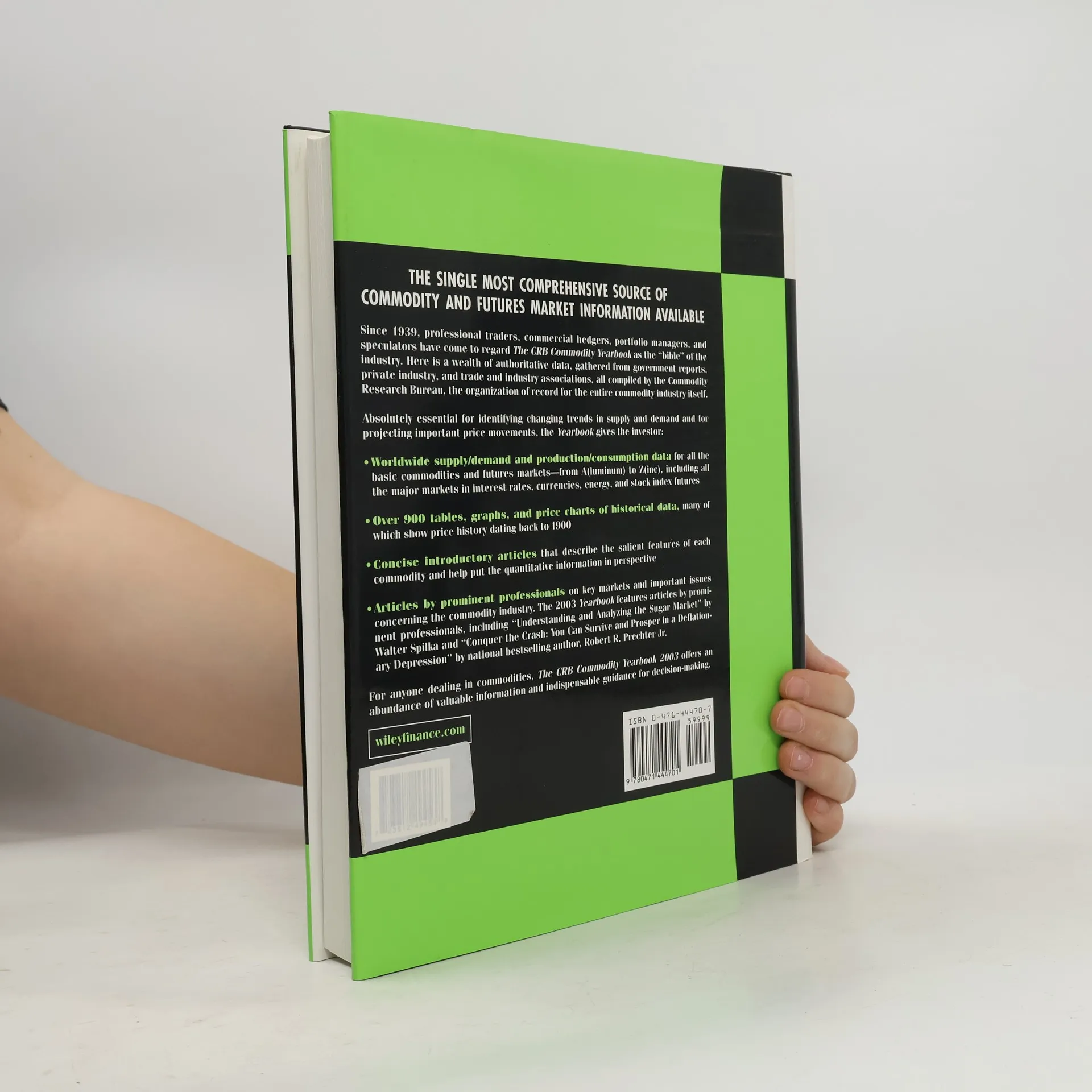 The single most comprehensive source of commodity and futures market information availableSince 1939, professional traders, commercial hedgers, portfolio managers, and speculators have come to regard The CRB Commodity Yearbook as the "bible" of the industry. Here is a wealth of authoritative data, gathered from government reports, private industry, and trade and industry associations, all compiled by the Commodity Research Bureau, the organization of record for the entire commodity industry itself.Absolutely essential for identifying changing trends in supply and demand and for projecting important price movements, the Yearbook gives the investor:Worldwide supply/demand and production/consumption data for all the basic commodities and futures markets-from A(luminum) to Z(inc), including all the major markets in interest rates, currencies, energy, and stock index futuresOver 900 tables, graphs, and price charts of historical data, many of which show price history dating back to 1900Concise introductory articles that describe the salient features of each commodity and help put the quantitative information in perspectiveArticles by prominent professionals on key markets and important issues concerning the commodity industry. The 2003 Yearbook features articles by prominent professionals, including "Understanding and Analyzing the Sugar Market" by Walter Spilka and "Conquer the Crash: You Can Survive and Prosper in a Deflationary Depression" by national bestselling author, Robert R. Prechter Jr.For anyone dealing in commodities, The CRB Commodity Yearbook 2003 offers an abundance of valuable information and indispensable guidance for decision-making.