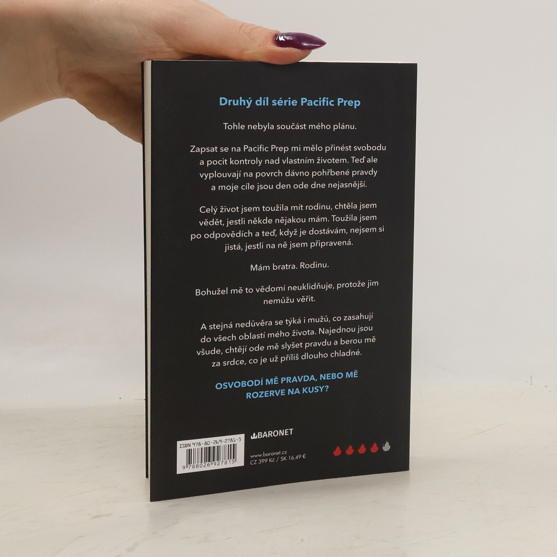 Druhý díl série Pacific Prep Tohle nebyla součást mého plánu. Zapsat se na Pacific Prep mi mělo přinést svobodu a pocit kontroly nad vlastním životem. Teď ale vyplouvají na povrch dávno pohřbené pravdy a moje cíle jsou den ode dne nejasnější. Celý život jsem toužila mít rodinu, chtěla jsem vědět, jestli někde nějakou mám. Toužila jsem po odpovědích a teď, když je dostávám, nejsem si jistá, jestli na ně jsem připravená. Mám bratra. Rodinu. Bohužel mě to vědomí neuklidňuje, protože jim nemůžu věřit. A stejná nedůvěra se týká i mužů, co zasahují do všech oblastí mého života. Najednou jsou všude, chtějí ode mě slyšet pravdu a berou mě za srdce, co je už příliš dlouho chladné. Osvobodí mě pravda, nebo mě rozerve na kusy?
