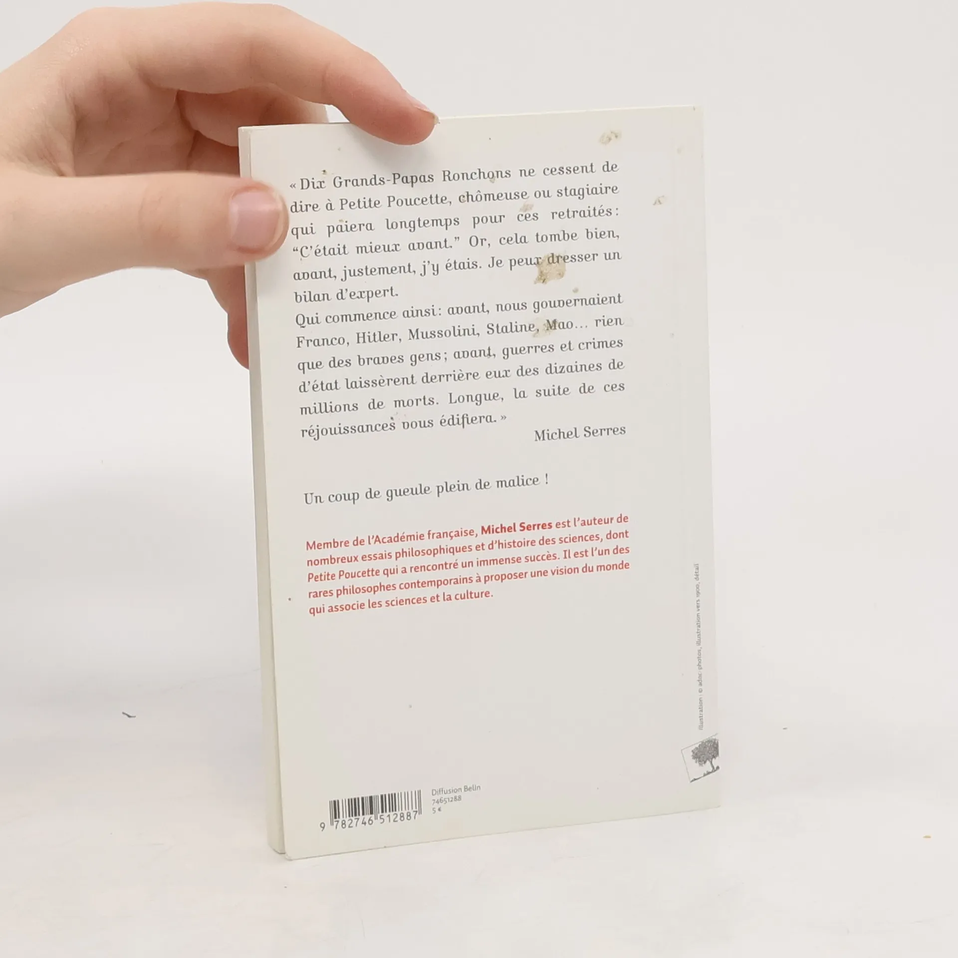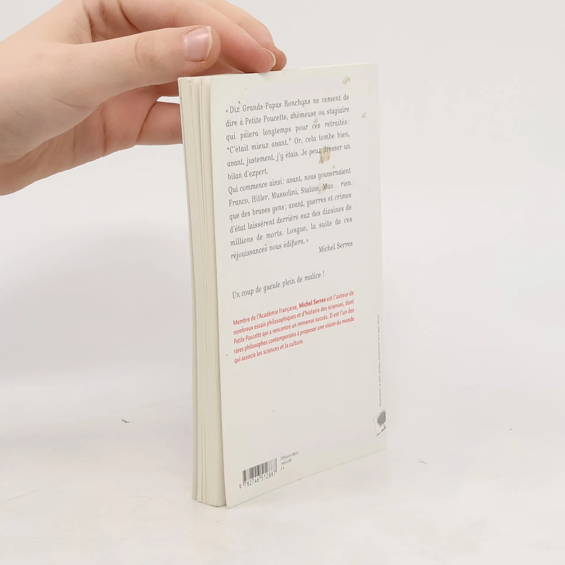 Avant ? Justement j’y étais ! Je vais vous raconter… « Dix Grands-Papas Ronchons ne cessent de dire à Petite Poucette, chômeuse ou stagiaire qui paiera longtemps pour ces retraités : “C’était mieux avant.” Or, cela tombe bien, avant, justement, j’y étais. Je peux dresser un bilan d’expert. Qui commence ainsi : avant, nous gouvernaient Franco, Hitler, Mussolini, Staline, Mao… rien que des braves gens ; avant, guerres et crimes d’état laissèrent derrière eux des dizaines de millions de morts. Longue, la suite de ces réjouissances vous édifiera. » Michel Serres