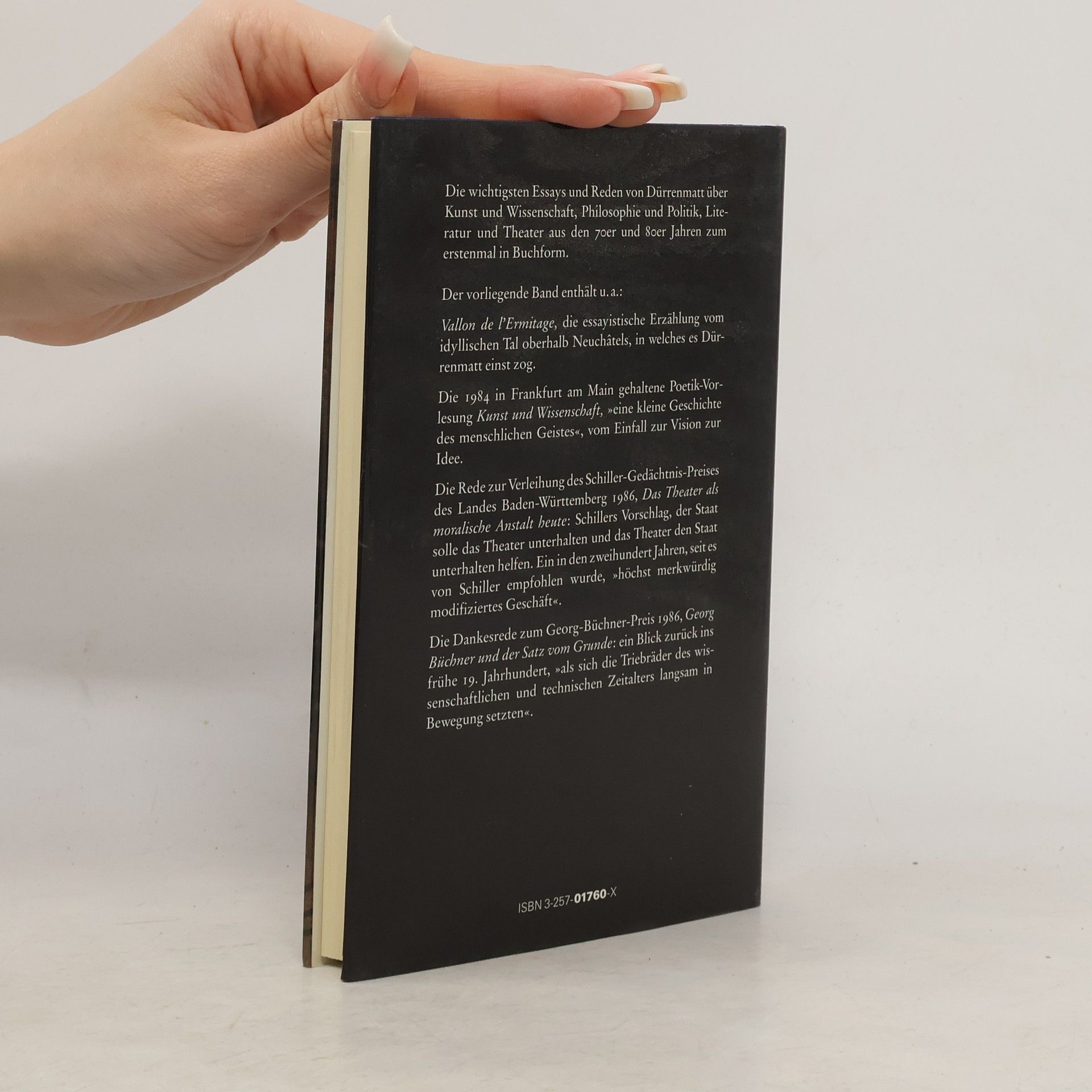 Die wichtigsten Essays und Reden von Dürrenmatt über Kunst und Wissenschaft, Philosophie und Politik, Literatur und Theater aus den 70er und 80er Jahren zum erstenmal in Buchform. Vallon de l'Ermitage, die essayistische Erzählung vom idyllischen Tal oberhalb Neuchâtels, in welches es Dürrenmatt einst zog. Die 1984 in Frankfurt am Main gehaltene Poetik-Vorlesung Kunst und Wissenschaft, »eine kleine Geschichte des menschlichen Geistes«, vom Einfall zur Vision zur Idee. Die Rede zur Verleihung des Schiller-Gedächtnis-Preises des Landes Baden-Württemberg 1986, Das Theater als moralische Anstalt heute: Schillers Vorschlag, der Staat solle das Theater unterhalten und das Theater den Staat unterhalten helfen. Ein in den zweihundert Jahren, seit es von Schiller empfohlen wurde, höchst merkwürdig modifiziertes Geschäft. Die Dankesrede zum Georg-Büchner-Preis 1986, Georg Büchner und der Satz vom Grunde: ein Blick zurück ins frühe 19. Jahrhundert, als sich die Triebräder des wissenschaftlichen und technischen Zeitalters langsam in Bewegung setzten."