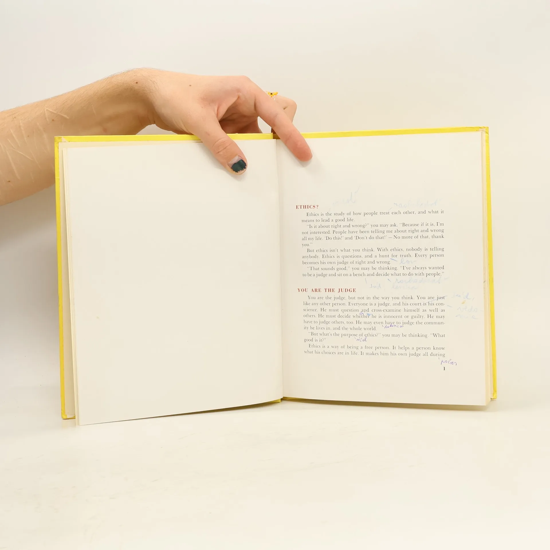 Ethics, the study of how people treat other, is a hunt for truth as every person becomes a judge of right and wrong. It is also the way to become a free person, since it helps one know what the choices are in life. "The First Book of Ethics" is about how people have tried to find the answers, and how each person may find them.