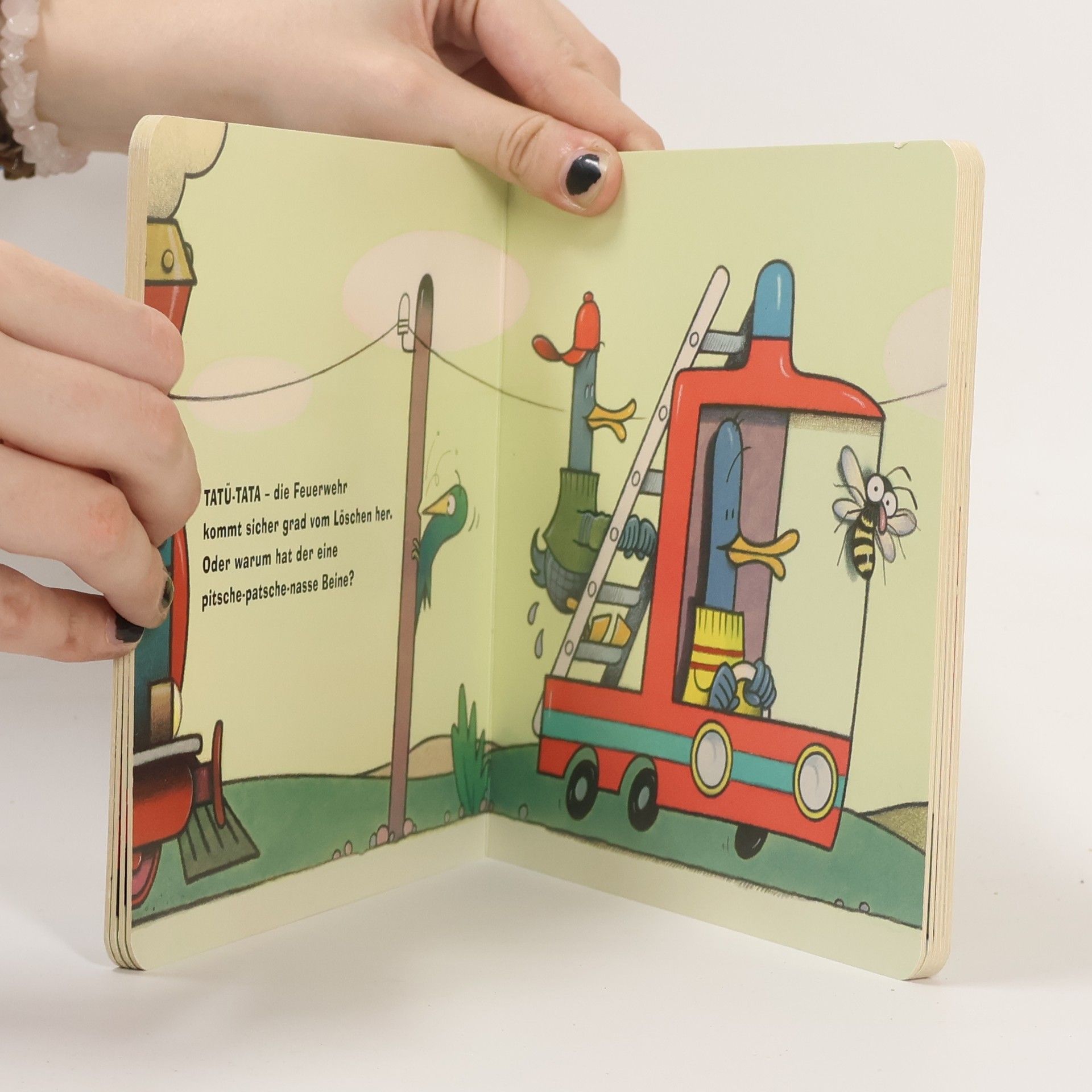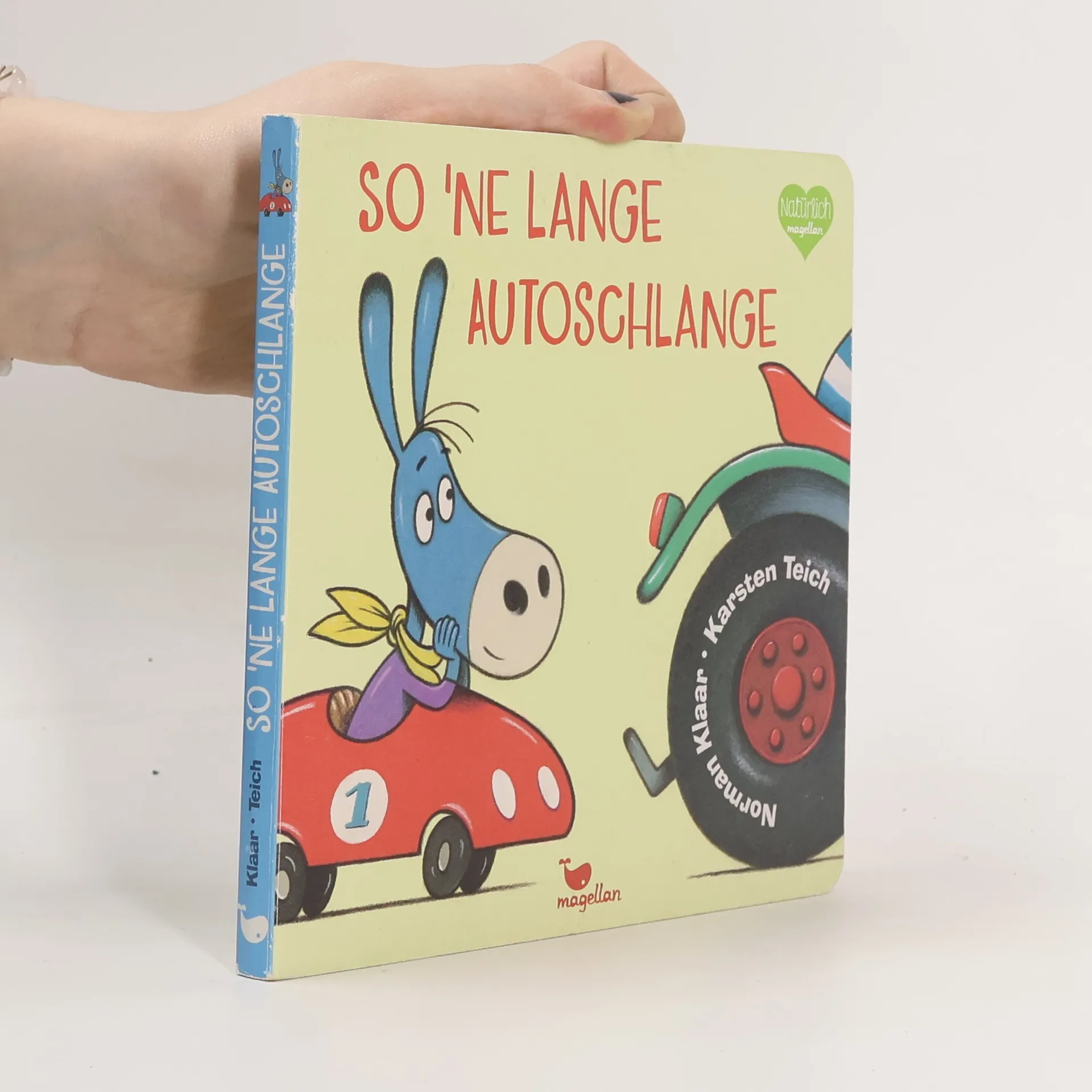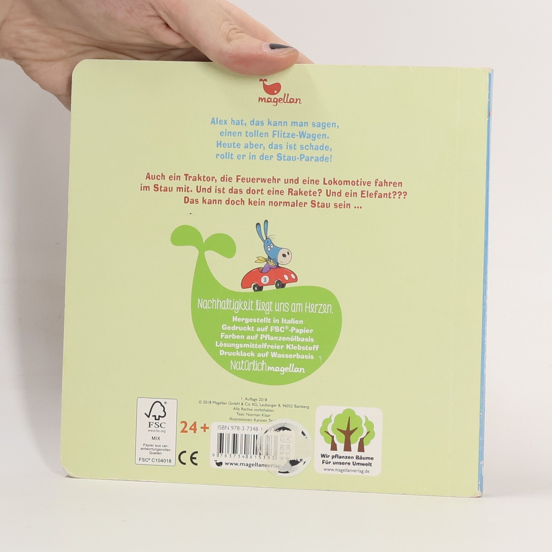 Alex hat, das kann man sagen, einen tollen Flitze-Wagen. Heute aber, das ist schade, rollt er in der Stau-Parade! Auch ein Abschleppwagen, die Feuerwehr und eine Lokomotive fahren im Stau mit. Und ist das dort eine Rakete? Und ein Elefant??? Das kann doch kein normaler Stau sein …