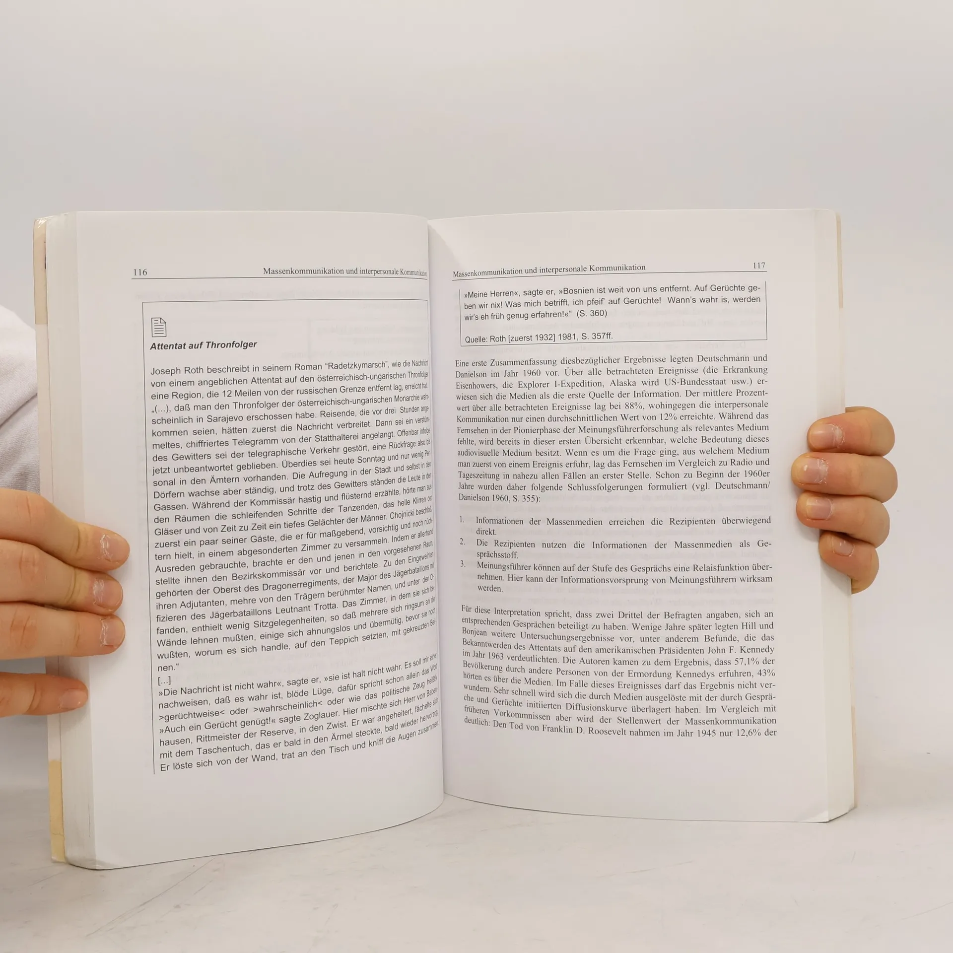 Die Entwicklung der (Massen-)Medien - Kommunikation, Massenkommunikation, Wirkung - Wirkungsmodelle und Forschungstraditionen - Spektakuläre Medienwirkungen - Die Meinungsführerforschung - Die Glaubwürdigkeit der Medien - Die Agenda Setting-Forschung - Die Wirklichkeit der Medien - Öffentlichkeit, öffentliche Meinung und die Bedeutung der Medien - Das Medium und die Botschaft - Die Wissenskluft-Forschung - Konturen der Mediengesellschaft