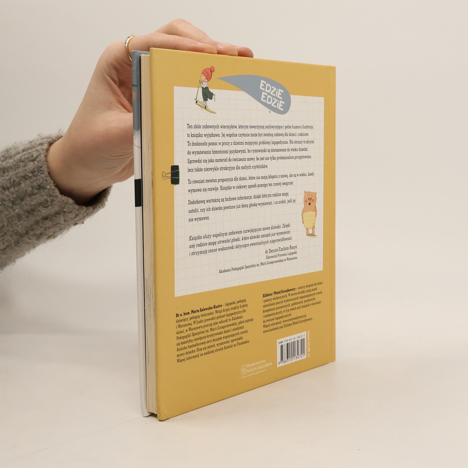 Ten zbiór zabawnych wierszyków, którym towarzyszą zachwycające i pełne humoru ilustracje, to książka wyjątkowa. Jej wspólne czytanie może być świetną zabawą dla dzieci i rodziców. To doskonała pomoc w pracy z dziećmi mającymi problemy logopedyczne. Nie straszy trudnymi do wymówienia łamańcami językowymi, bo rymowanki są dostosowane do wieku dziecka. Sprawdzi się jako materiał do ćwiczenia mowy, bo jest nie tylko profesjonalnie przygotowany, lecz także niezwykle atrakcyjny dla małych czytelników. To również świetna propozycja dla dzieci, które nie mają kłopotu z mową, ale są w wieku, kiedy wymowa się rozwija. Książka w ciekawy sposób pomaga ten rozwój wesprzeć.Dodatkową wartością są fachowe informacje, dzięki którym rodzice mogą ustalić, czy ich dziecko powinno już daną głoskę wymawiać, i co zrobić, jeśli jej nie wymawia.