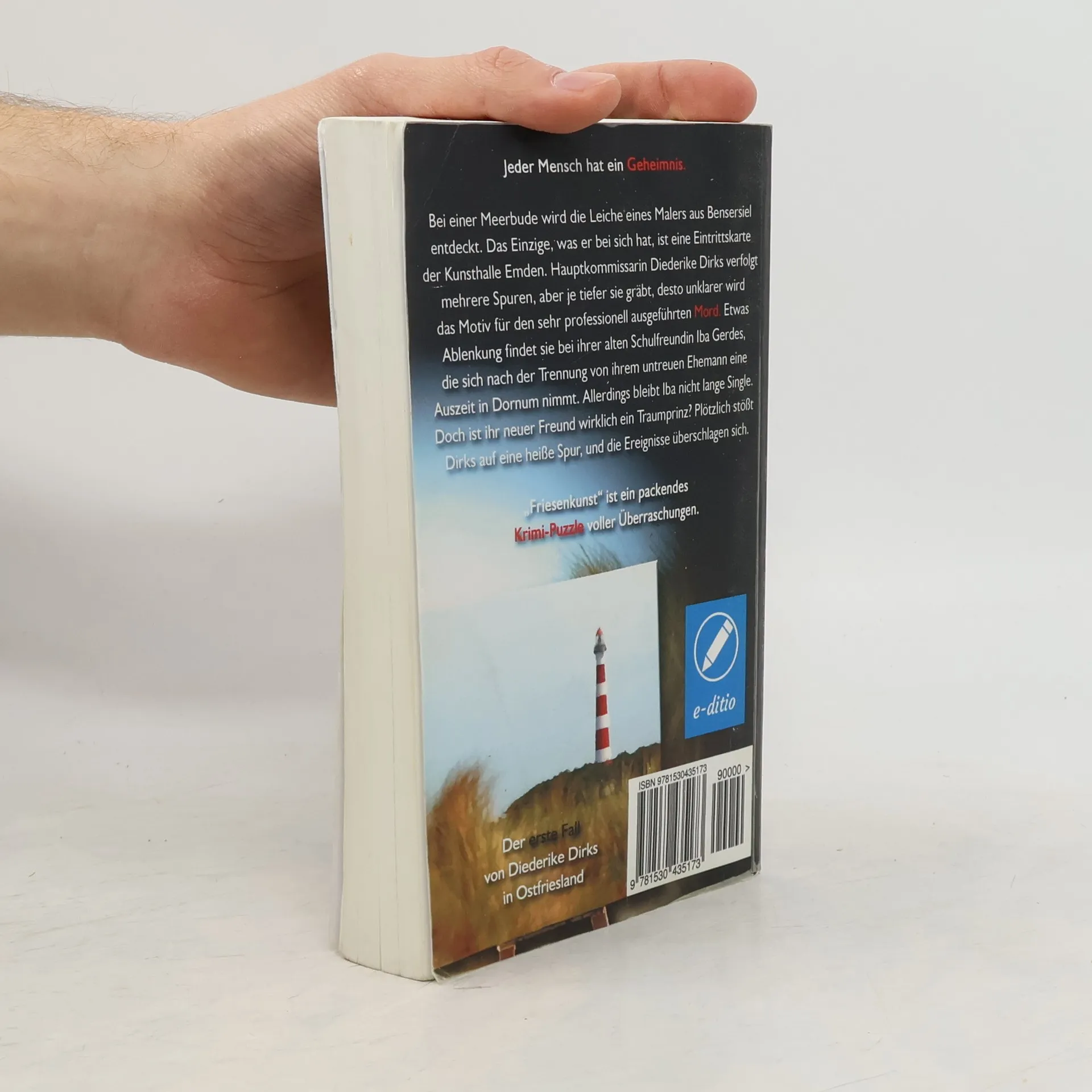 Jeder Mensch hat ein Geheimnis Bei einer Meerbude wird die Leiche eines Malers aus Bensersiel entdeckt. Das Einzige, was er bei sich hat, ist eine Eintrittskarte der Kunsthalle Emden. Hauptkommissarin Diederike Dirks verfolgt mehrere Spuren, aber je tiefer sie gr�bt, desto unklarer wird das Motiv f�r den sehr professionell ausgef�hrten Mord. Etwas Ablenkung findet sie bei ihrer alten Schulfreundin Iba Gerdes, die sich nach der Trennung von ihrem untreuen Ehemann eine Auszeit in Dornum nimmt. Allerdings bleibt Iba nicht lange Single. Doch ist ihr neuer Freund wirklich ein Traumprinz? Pl�tzlich st��t Dirks auf eine hei�e Spur, und die Ereignisse �berschlagen sich. "Friesenkunst" ist ein packendes Krimi-Puzzle voller �berraschungen. Der Ostfriesenkrimi "Friesenkunst" ist der erste Fall von Diederike Dirks in Ostfriesland. Dieses Buch ist mit dem e-ditio Qualit�tssiegel f�r ein hochwertiges Lektorat ausgezeichnet. Es war einer der beiden Gewinner beim e-ditio Independent Publishing Award 2016 und einer der Kindle Jahresbestseller 2016 in der Kategorie Krimi/Thriller. Leserstimmen "Spannung inmitten der wundersch�nen Landschaft Ostfrieslands." "Klasse Kommissare, viel Spannung und super Unterhaltung." "Und dann war ich v�llig �berrascht, doch die L�sung war einleuchtend. Das hat mir besonders Spa� gemacht." "Die Figuren, sie sind nie holzschnittartig, sondern absolut lebendig."