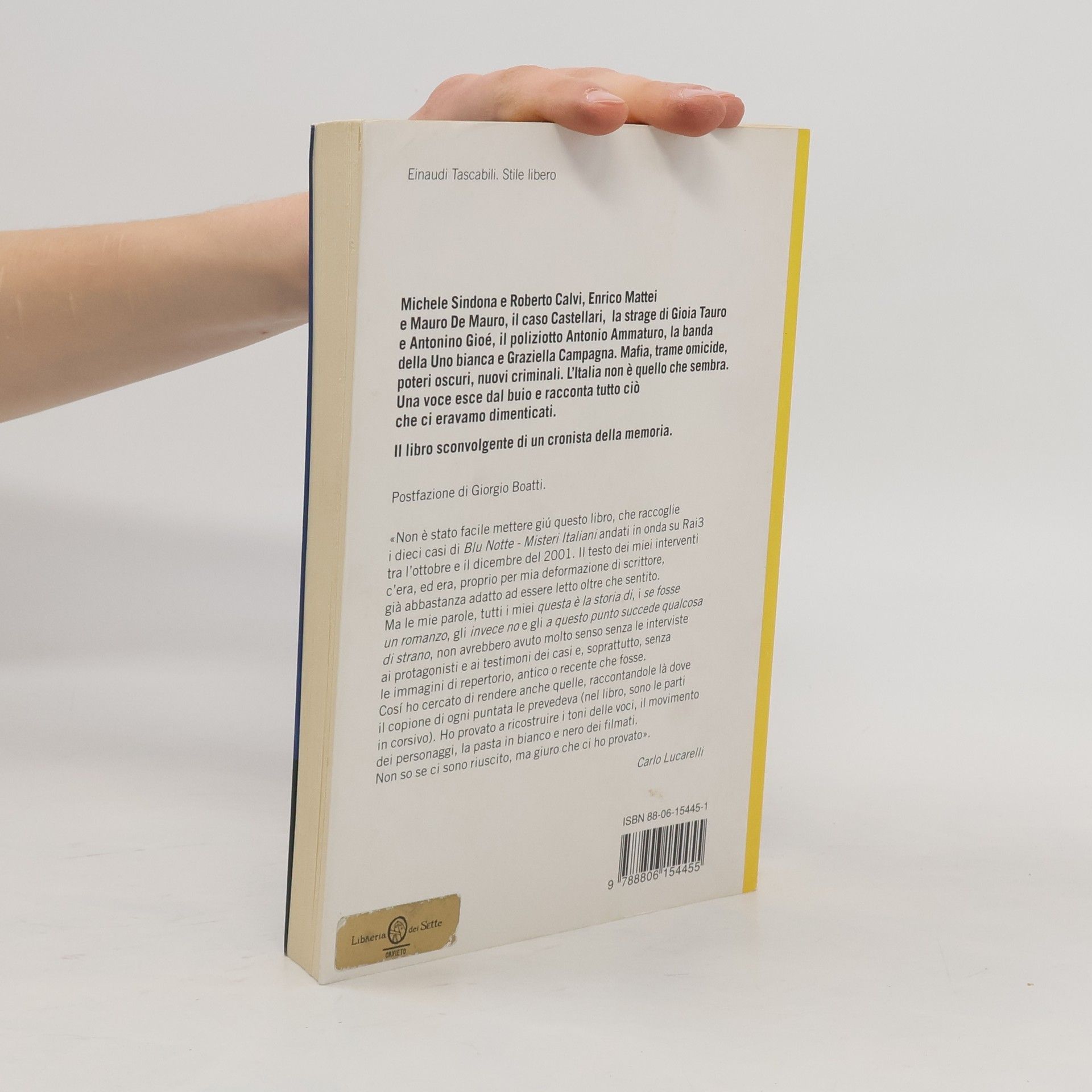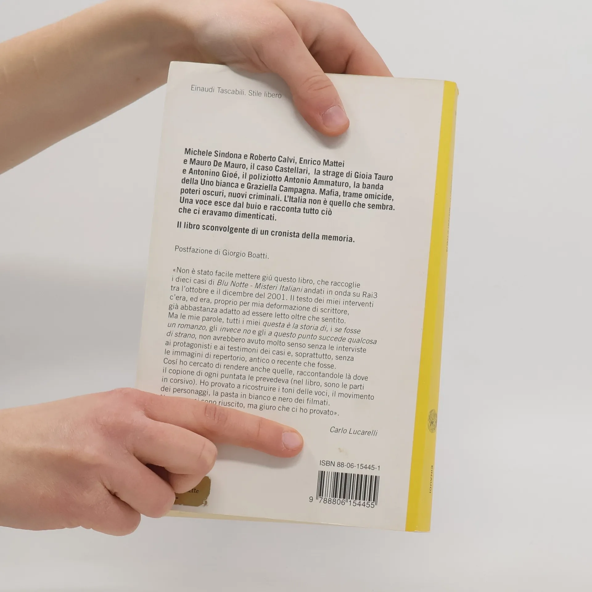 «Non è stato facile mettere giú questo libro, che raccoglie i dieci casi di Blu Notte - Misteri Italiani andati in onda su Rai3 tra l'ottobre e il dicembre del 2001. Il testo dei miei interventi c'era, ed era, proprio per mia deformazione di scrittore, già abbastanza adatto ad essere letto oltre che sentito. Ma le mie parole, tutti i miei questa è la storia di, i se fosse un romanzo, gli invece no e gli a questo punto succede qualcosa di strano, non avrebbero avuto molto senso senza le interviste ai protagonisti e ai testimoni dei casi e, soprattutto, senza le immagini di repertorio, antico o recente che fosse. Cosí ho cercato di rendere anche quelle, raccontandole là dove il copione di ogni puntata le prevedeva (nel libro, sono le parti in corsivo). Ho provato a ricostruire i toni delle voci, il movimento dei personaggi, la pasta in bianco e nero dei filmati. Non so se ci sono riuscito, ma giuro che ci ho provato».
