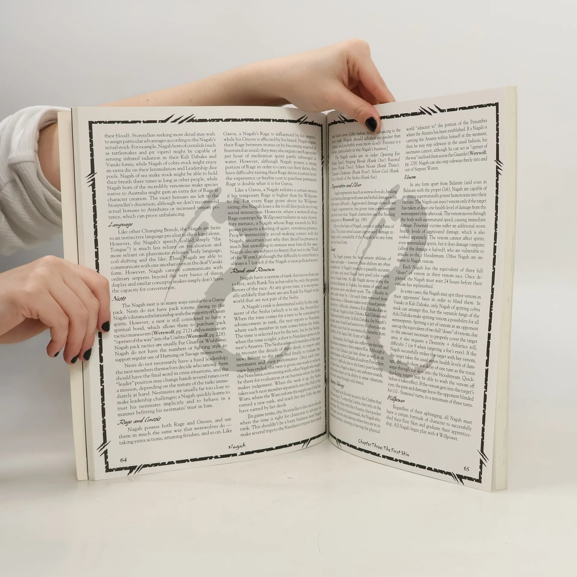 Werewolf: The Apocalypse is about anger over the loss of what the shapeshifting Garou hold dearest: Gaia, the Earth itself. Corruption from without and within has caused the destruction not only of the Garou's environment, but also of their families, friends and culture, which extends in an unbroken line to the very dawn of life. No matter how righteously the Garou hold themselves, no matter how they prey on their destroyers, the corruption spreads. Now the time for reconciliation is past. This grave insult against Gaia can end in only one way: blood, betrayal... and rage. This Changing Breed Book delves into the mysteries of the most enigmatic and reclusive shapeshifters of all -- the deadly wereserpents.