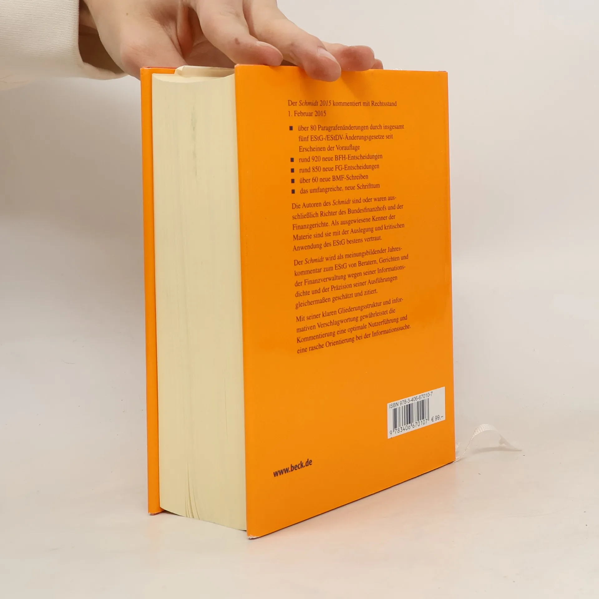Beck-Basistitel Danach entscheiden Finanzämter und Finanzgerichte Zum Werk Als Jahreskommentar berücksichtigt der „Schmidt“ in seiner Kommentierung mit Rechtsstand 1. Februar 2015 alle Änderungen des Erscheinungsjahres. Vorteile auf einen Blick - hoher Aktualitätsgrad - praxiserprobt - problem- und lösungsorientiert - erfahrene Richter-Autoren Zielgruppe Steuerberater, Wirtschaftsprüfer, Rechtsanwälte, Finanzverwaltung, Finanzgerichte, Unternehmen.