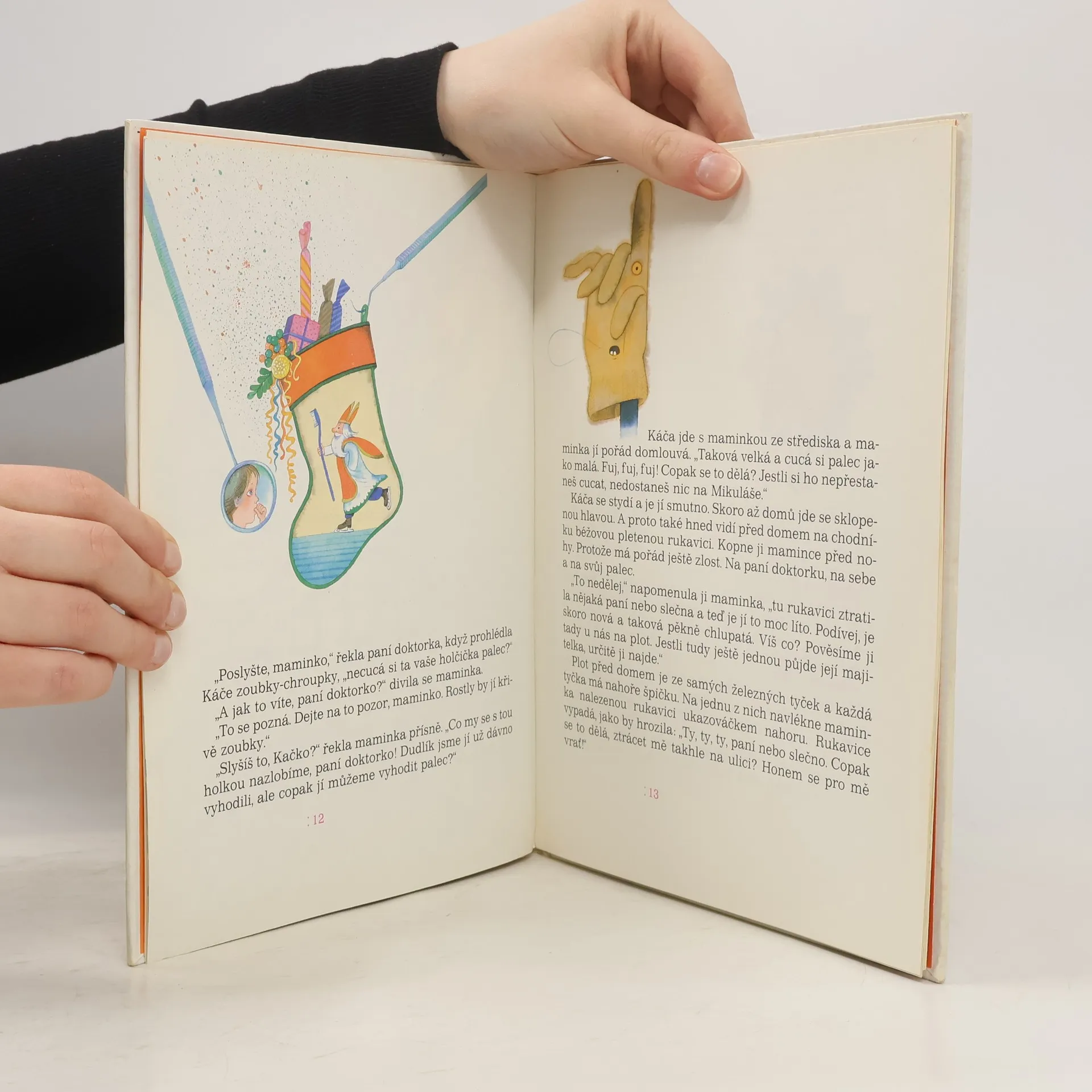 Knížka pro začínající čtenáře vypráví o malé Kačence, která našla na ulici ztracenou špinavou rukavici. Maminka ji vyprala a vykouzlila z ní báječné překvapení... které si děti s pomocí dospělého mohou doma snadno také vyrobit.