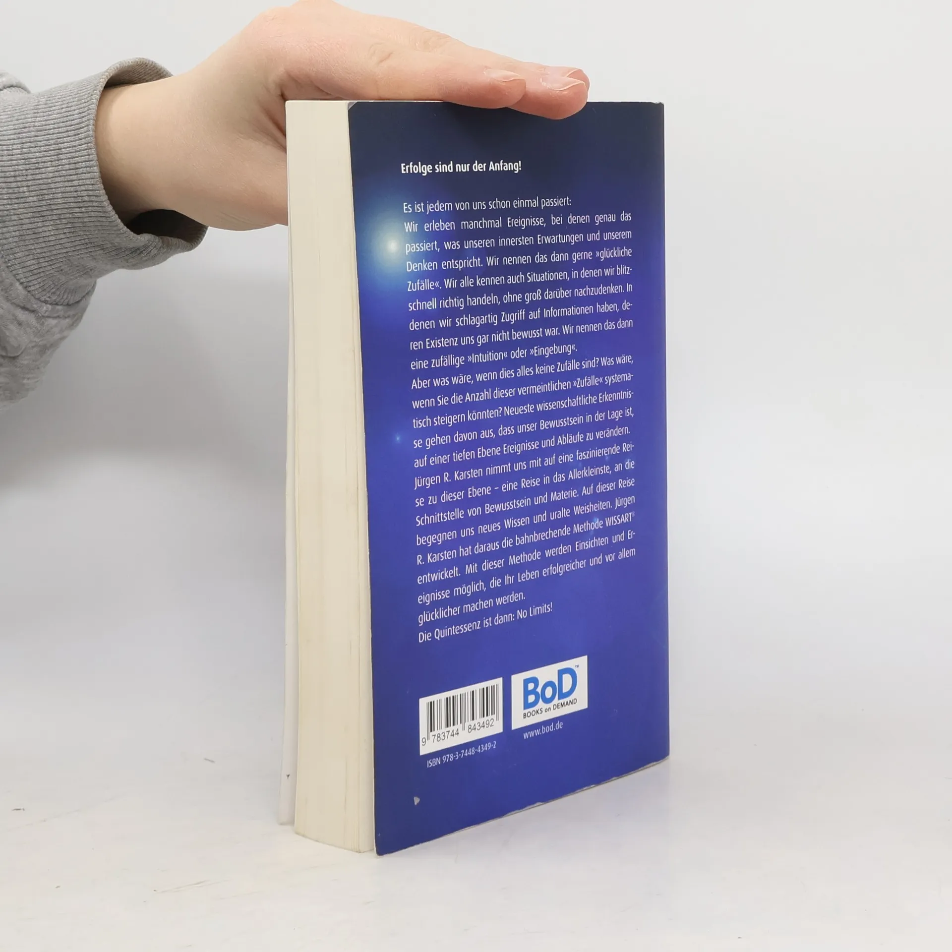 Erfolge sind nur der Anfang! Es ist jedem von uns schon einmal Wir erleben manchmal Ereignisse, bei denen genau das passiert, was unseren innersten Erwartungen und unserem Denken entspricht. Wir nennen das dann gerne "glückliche Zufälle". Wir alle kennen auch Situationen, in denen wir blitzschnell richtig handeln, ohne groß darüber nachzudenken. In denen wir schlagartig Zugriff auf Informationen haben, deren Existenz uns gar nicht bewusst war. Wir nennen das dann eine zufällige "Intuition" oder "Eingebung". Aber was wäre, wenn dies alles keine Zufälle sind? Was wäre, wenn Sie die Anzahl dieser vermeintlichen "Zufälle" systematisch steigern könnten? Neueste wissenschaftliche Erkenntnisse gehen davon aus, dass unser Bewusstsein in der Lage ist, auf einer tiefen Ebene Ereignisse und Abläufe zu verändern. Jürgen R. Karsten nimmt uns mit auf eine faszinierende Reise zu dieser Ebene - eine Reise in das Allerkleinste, an die Schnittstelle von Bewusstsein und Materie. Auf dieser Reise begegnen uns neues Wissen und uralte Weisheiten. Jürgen R. Karsten hat daraus die bahnbrechende Methode WISSART(R) entwickelt. Mit dieser Methode werden Einsichten und Ereignisse möglich, die Ihr Leben erfolgreicher und vor allem glücklicher machen werden. Die Quintessenz ist No Limits!