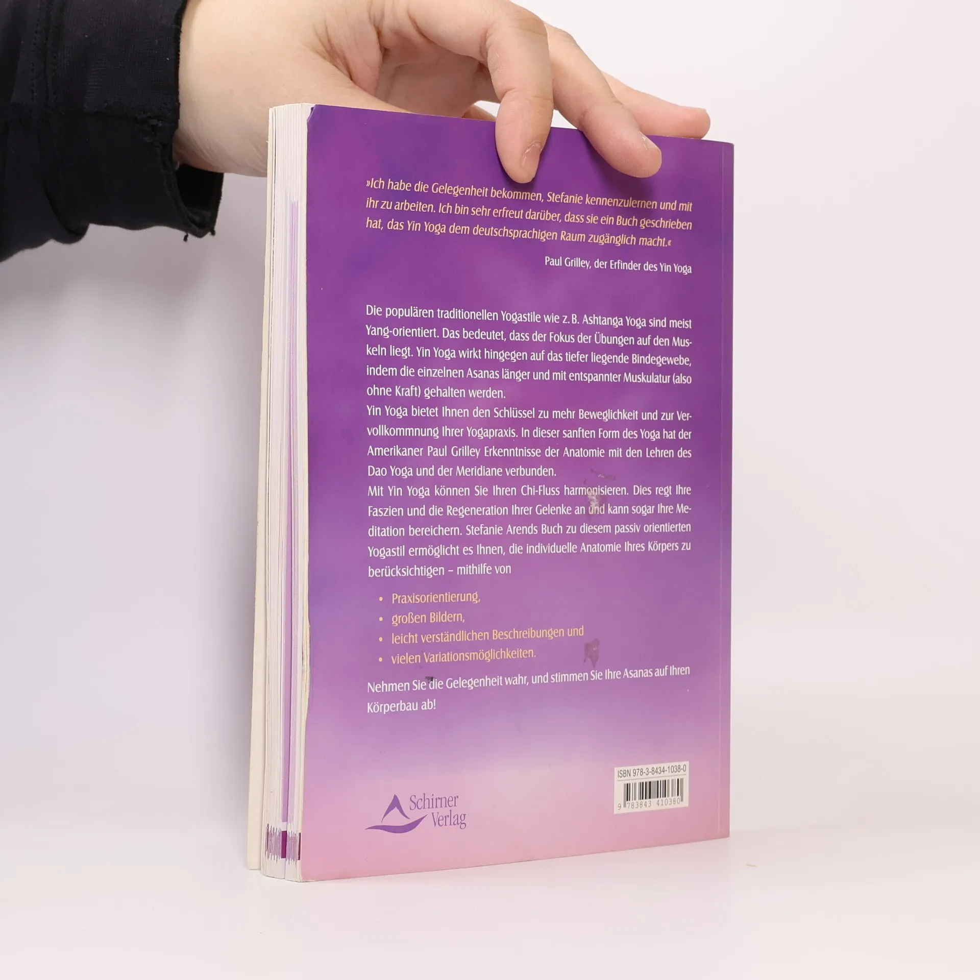 Als erste deutsche Autorin befasst sich Stefanie Arend in diesem Buch ausschließlich mit dem Yin-Yoga, dem Yoga-Stil des Amerikaners Paul Grilley. Er kombiniert die Verbindung von Asanas und Meridianen mit der menschlichen Anatomie und den Lehren des Dao-Yoga. Yin-Yoga zeichnet sich insbesondere durch Bewegungen aus, die ohne den aktiven, kraftvollen Einsatz der Muskeln erfolgen. Durch das längere Halten der Positionen werden die tieferen Schichten des Körpers aktiviert und der Chi-Fluss harmonisiert. Yin-Yoga lehrt auf sanfte Weise loszulassen, körperlich wie auch geistig. Dieses Buch soll dem Leser dabei helfen, beim Yoga seine individuelle Anatomie zu berücksichtigen, d. h., sich für die Zeichen des Körpers zu sensibilisieren. Bebilderte Übungen sowie zahlreiche Erklärungen zu Variationsmöglichkeiten unterstützen ihn dabei. Auf außergewöhnlich spannende und persönliche Weise schildert die Yoga-Lehrerin die Geschichte des Yin-Yoga und erläutert die grundlegenden Begriffe sowie deren Zusammenhänge. Auch die Wirkung dieser Yoga-Technik auf die individuellen Emotionen, die Meditationen und die Atmung werden berücksichtigt. Yin-Yoga ist die perfekte Ergänzung zu den populären, aktiv orientierten traditionellen Yoga-Ausrichtungen.