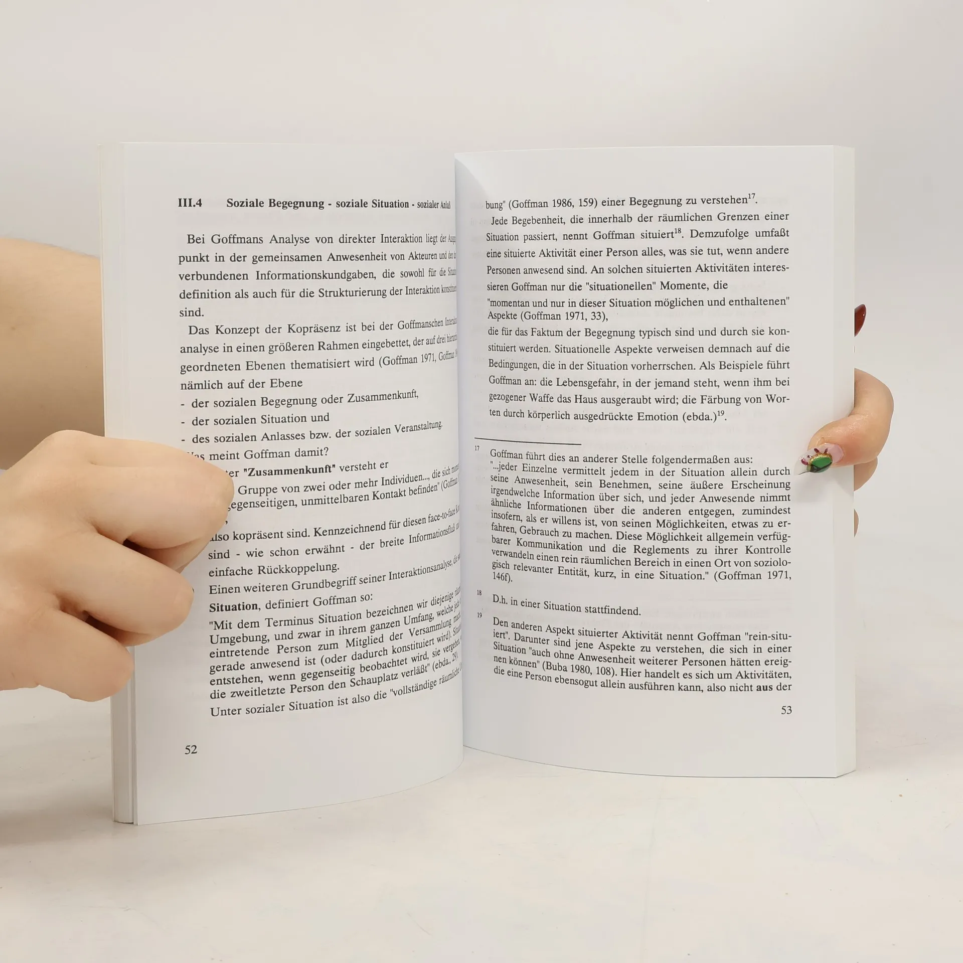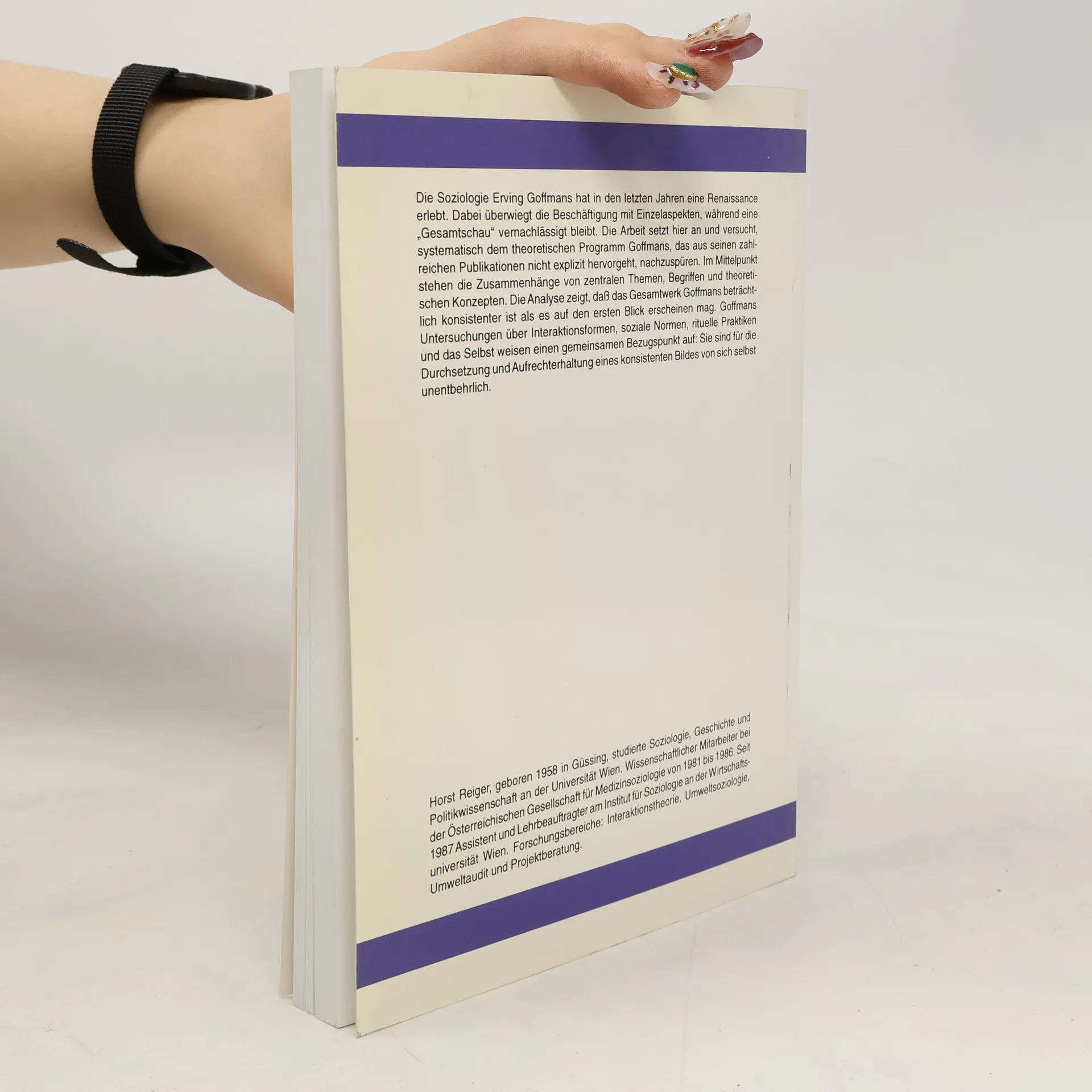 Die Soziologie Erving Goffmans hat in den letzten Jahren eine Renaissance erlebt. Dabei überwiegt die Beschäftigung mit Einzelaspekten, während eine «Gesamtschau» vernachläßigt bleibt. Die Arbeit setzt hier an und versucht, systematisch dem theoretischen Programm Goffmans, das aus seinen zahlreichen Publikationen nicht explizit hervorgeht, nachzuspüren. Im Mittelpunkt stehen die Zusammenhänge von zentralen Themen, Begriffen und theoretischen Konzepten. Die Analyse zeigt, daß das Gesamtwerk Goffmans beträchtlich konsistenter ist als es auf den ersten Blick erscheinen mag. Goffmans Untersuchungen über Interaktionsformen, soziale Normen, rituelle Praktiken und das Selbst weisen einen gemeinsamen Bezugspunkt auf: Sie sind für die Durchsetzung und Aufrechterhaltung eines konsistenten Bildes von sich selbst unentbehrlich.