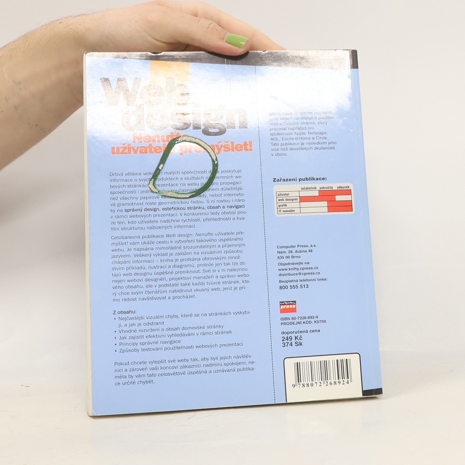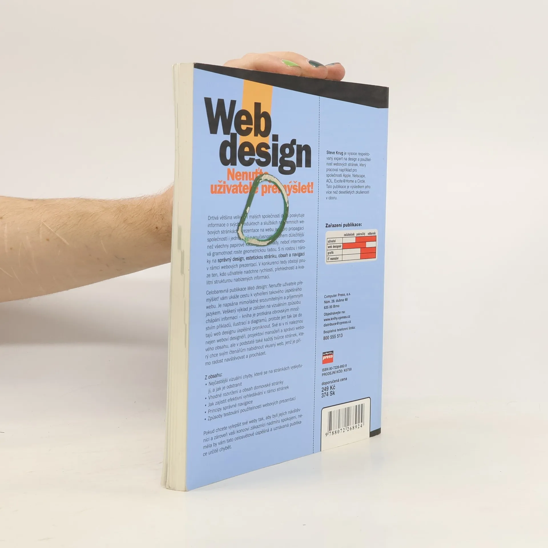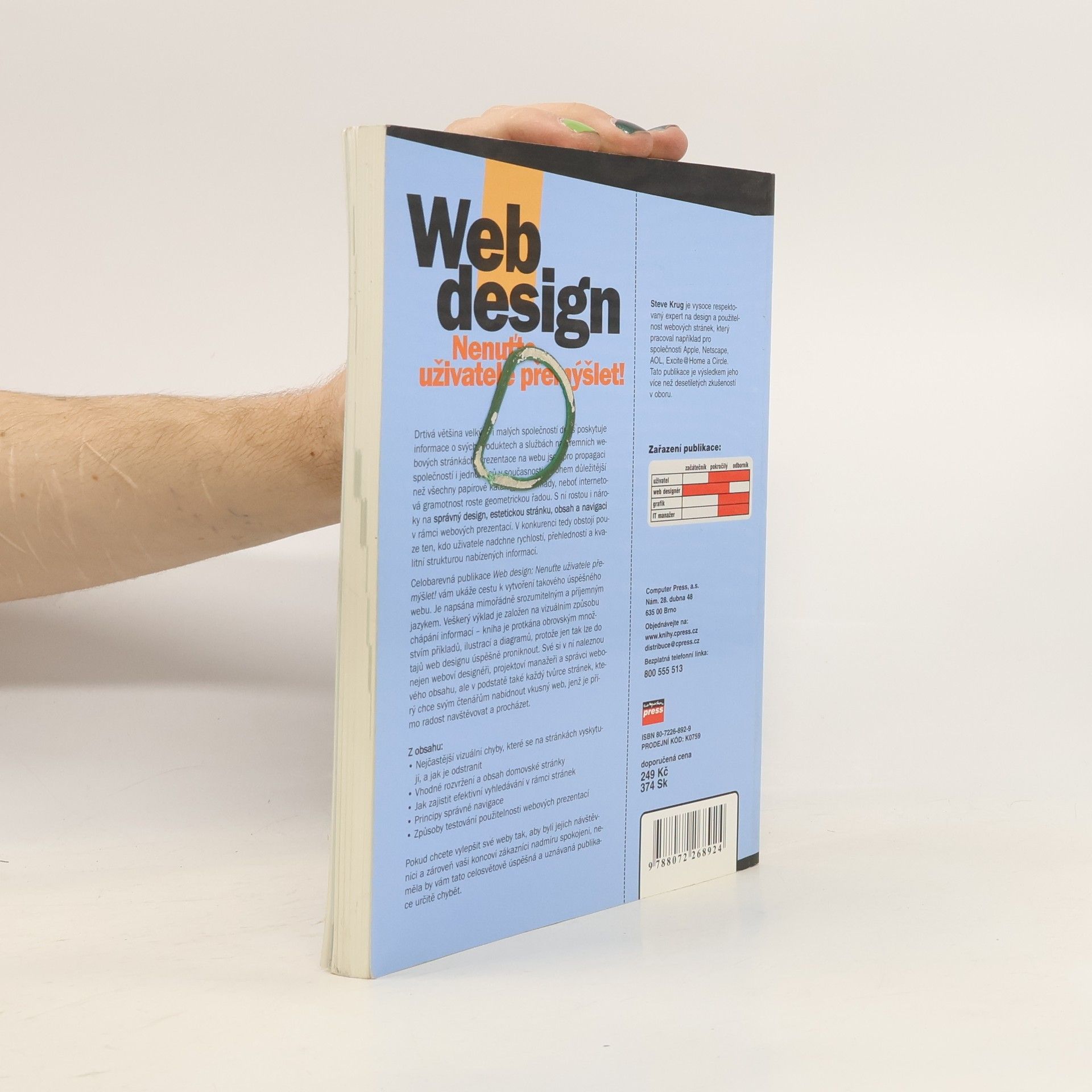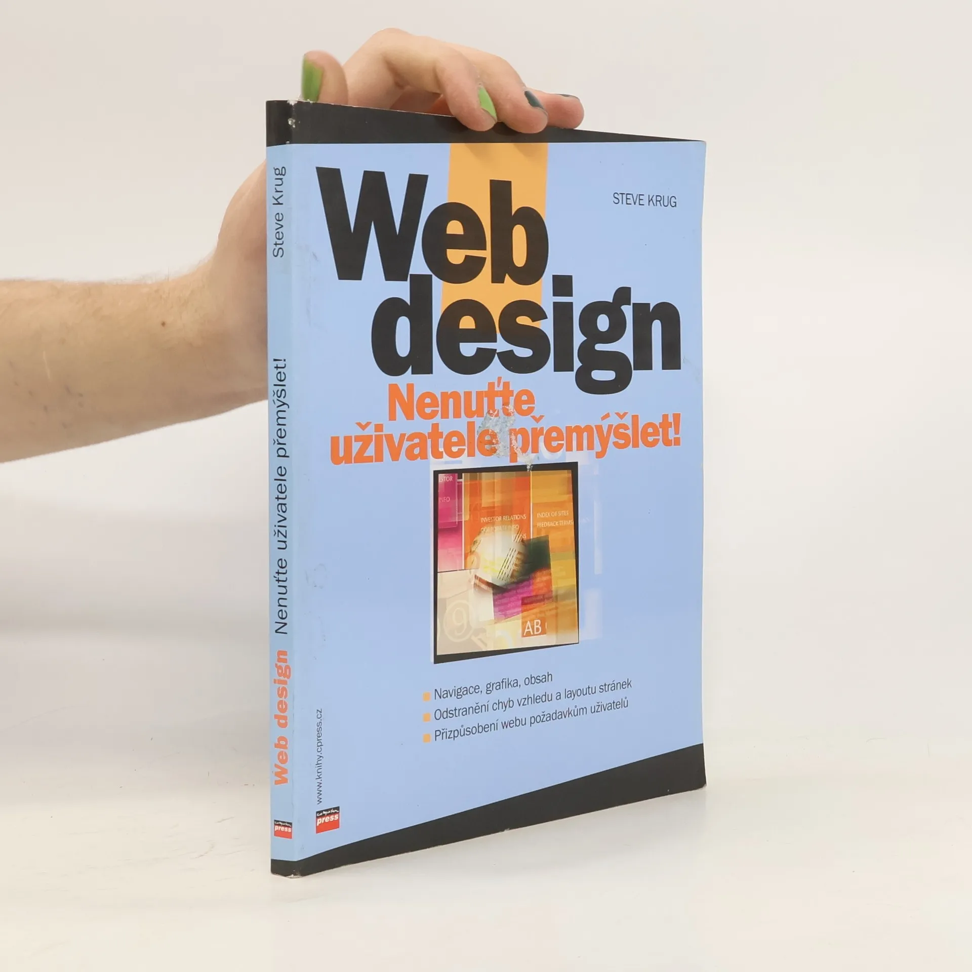 Drtivá většina velkých i malých společností dnes poskytuje informace o svých produktech a službách na firemních webových stránkách. Prezentace na webu jsou pro propagaci společností i jednotlivců v současnosti mnohem důležitější než všechny papírové katalogy dohromady, neboť internetová gramotnost roste geometrickou řadou. S ní rostou i nároky na správný design, estetickou stránku, obsah a navigaci v rámci webových prezentací. V konkurenci tedy obstojí pouze ten, kdo uživatele nadchne rychlostí, přehledností a kvalitní strukturou nabízených informací. Celobarevná publikace Web design: Nenuťte uživatele přemýšlet! vám ukáže cestu k vytvoření takového úspěšného webu. Je napsána mimořádně srozumitelným a příjemným jazykem. Veškerý výklad je založen na vizuálním způsobu chápání informací – kniha je protkána obrovským množstvím příkladů, ilustrací a diagramů, protože jen tak lze do tajů web designu úspěšně proniknout. Své si v ní naleznou nejen weboví designéři, projektoví manažeři a správci webového obsahu, ale v podstatě také každý tvůrce stránek, který chce svým čtenářům nabídnout vkusný web, jenž je přímo radost navštěvovat a procházet.