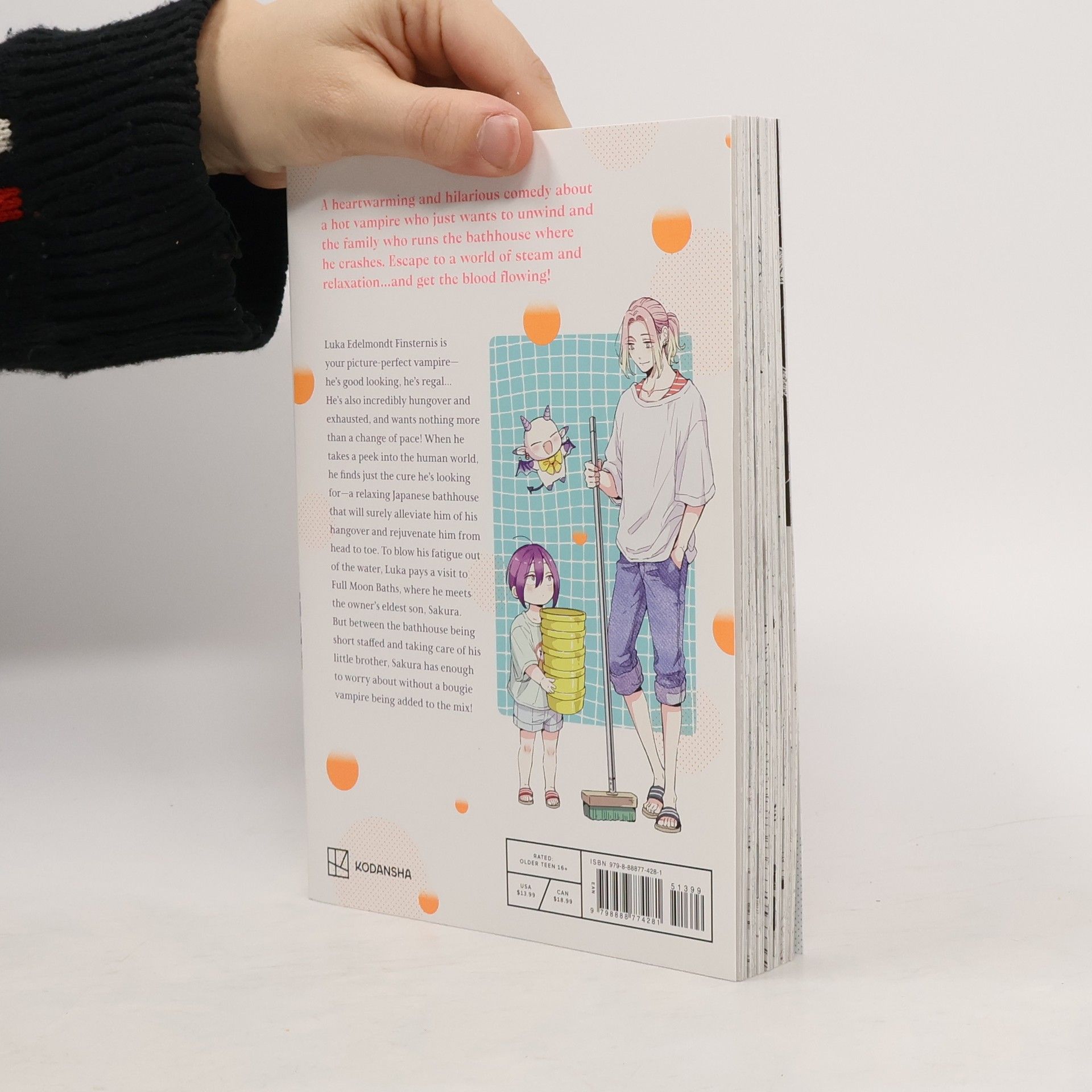 A heartwarming and hilarious comedy manga about a hot vampire who just wants to unwind and the family who runs the bathhouse where he crashes. Escape to a world of steam and relaxation...and get the blood flowing! A full story in one volume! Luka Edelmondt Finsternis is your picture-perfect vampire--he's good looking, he's regal... He's also usually incredibly hungover and exhausted, and wants nothing more than a change of pace from his routine! When he takes a peek into the human world, he finds just the cure he's looking for--a relaxing Japanese bathhouse that will surely cure him of his hangover and rejuvenate him from head to toe. To blow his fatigue out of the water, Luka pays a visit to Full Moon Baths where he meets the bathhouse's eldest son, Sakura. But between the bathhouse being short staffed and taking care of his little brother, Sakura has enough to worry about without a bougie vampire being added to the mix!