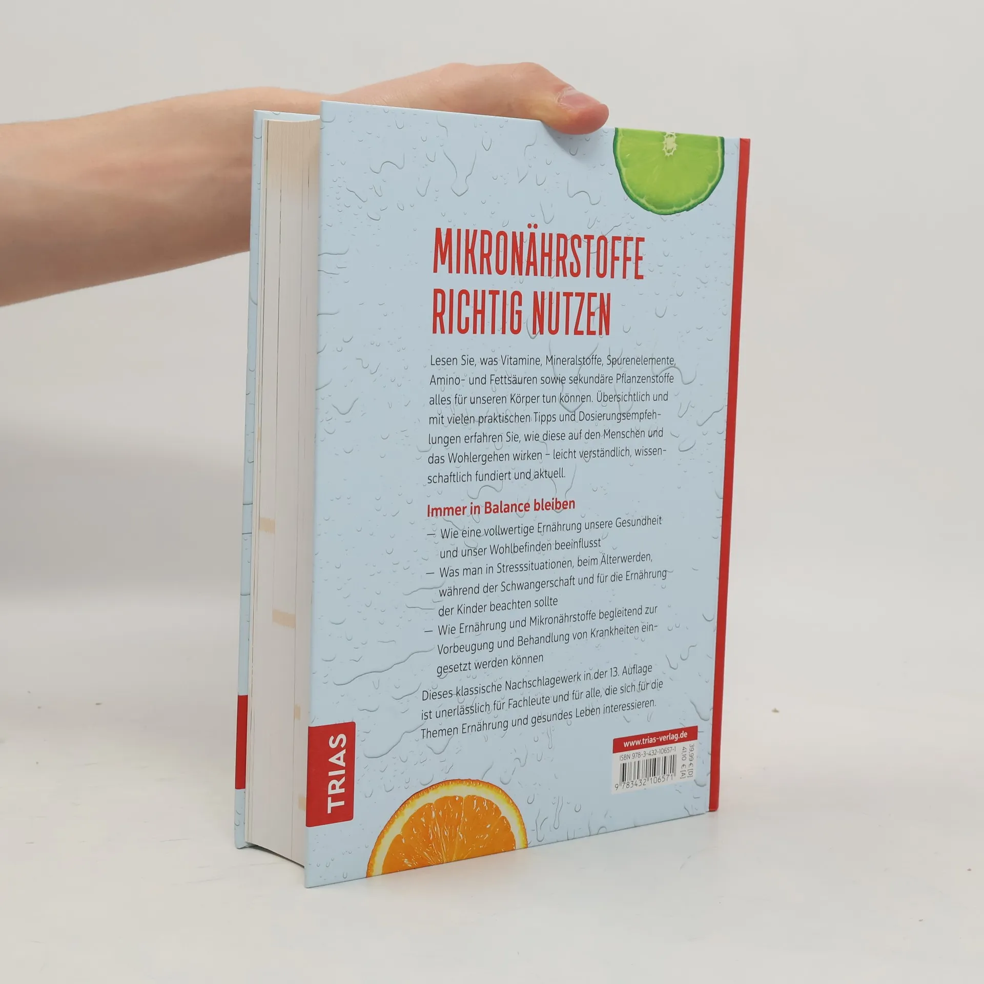 Mikronährstoffe richtig nutzen! Lesen Sie, was Vitamine, Mineralstoffe, Spurenelemente, Amino- und Fettsäuren sowie sekundäre Pflanzenstoffe alles für unseren Körper tun können. Übersichtlich und mit vielen praktischen Tipps und Dosierungsempfehlungen erfahren Sie, wie diese auf den Menschen und das Wohlergehen wirken - leicht verständlich, wissenschaftlich fundiert und aktuell. Immer in Balance bleiben: - Wie eine vollwertige Ernährung unsere Gesundheit und unser Wohlbefinden beeinflusst. - Was man in Stresssituationen, beim Älterwerden, während der Schwangerschaft und für die Ernährung der Kinder beachten sollte. - Wie Ernährung und Mikronährstoffe begleitend zur Vorbeugung und Behandlung von Krankheiten eingesetzt werden können. Dieses klassische Nachschlagewerk in der 13. Auflage ist unerlässlich für Fachleute und für alle, die sich für die Themen Ernährung und gesundes Leben interessieren.