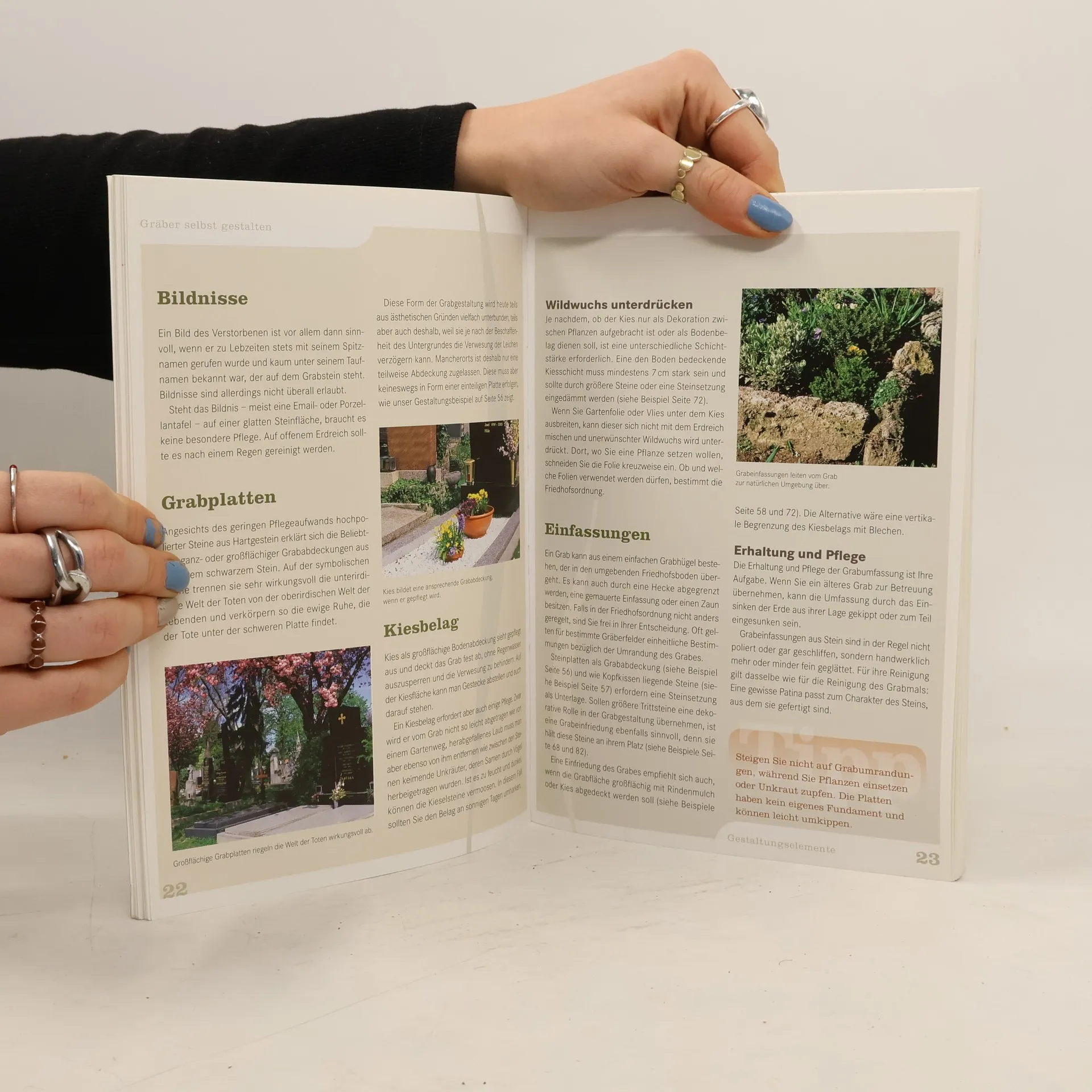 Die Kunsthistorikerin U. Müller-Kaspar und die Gartencenter-Fachberaterin M. Prinz begleiten mithilfe dieses Ratgebers zur Anlage und Pflege von Grabstätten den Entscheidungsprozess von der Wahl des Grabes bis hin zu seiner konkreten Gestaltung. Behandelt werden zunächst die Themen Friedhofswahl, Friedhofsordnung, Grabformen, Grabgestaltung, Pflegeaufwand und Organisation sowie Gestaltungselemente wie Grabmale, Steine, Skulpturen, Grabplatten, Bildnisse und Pflanzschalen. Das folgende der Grabbepflanzung gewidmete Kapitel erläutert den Symbolgehalt von Pflanzen, Farben und Formen und stellt Dauer- und Wechselbepflanzungen vor. 32 Pflanzbeispiele, die unterschiedlichen Standorten, Lieblingsfarben und Präferenzen gerecht werden, zeigen anschaulich das breite Spektrum an Gestaltungsmöglichkeiten. Preiswerter als dieser praxisorientierte, mit vielen Fotos und Pflanzplänen ansprechend gestaltete Band sind die beiden Vergleichstitel Ch. James: "Gräber schön gestalten" (zuletzt BA 1/08) und "Grabgestaltung" (Kosmos, zuletzt BA 6/08), fundierter B. Bross-Burkhardt: "Gräber gestalten und pflegen" (BA 9/03). (2)