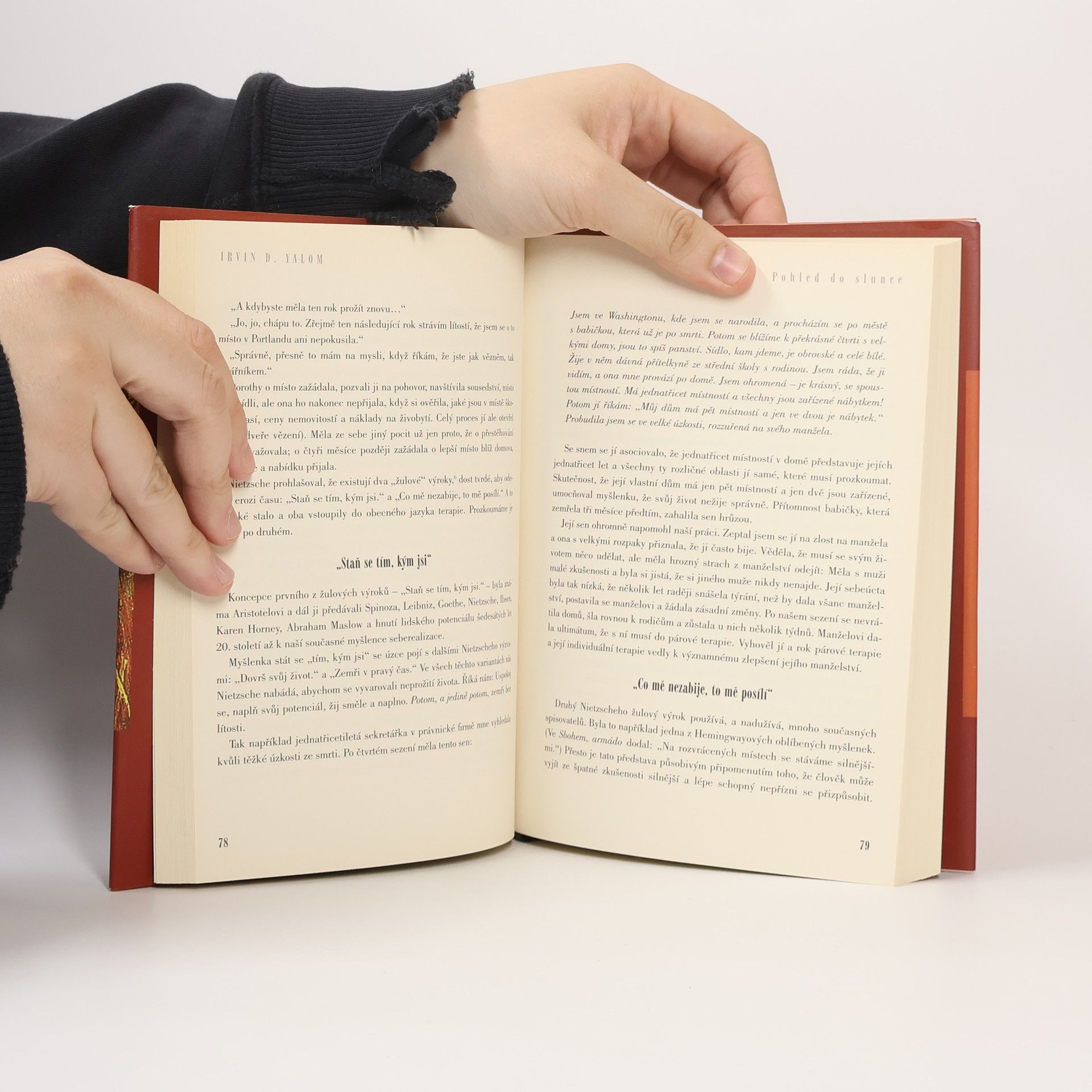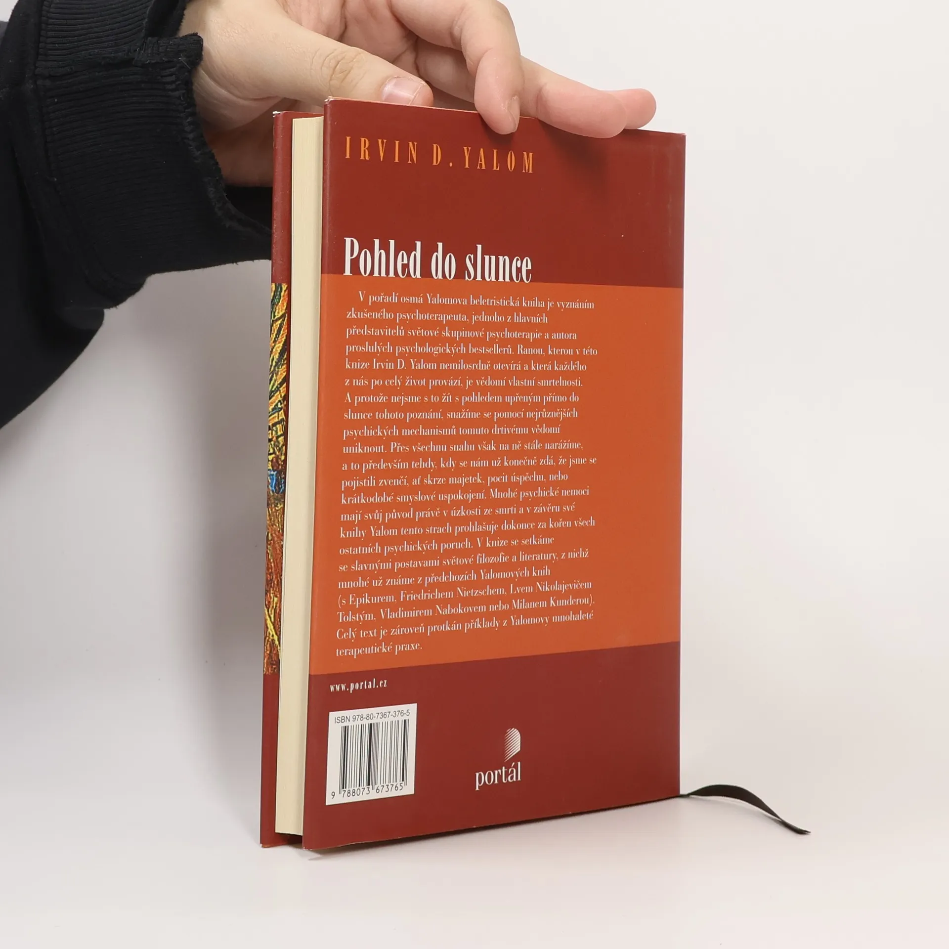 S podtitulem: O překonávání strachu ze smrti. Ranou, kterou ve své osmé beletristické knize psychoterapeut I. D. Yalom otevírá, a která každého z nás po celý život provází, je vědomí vlastní smrtelnosti. A protože nejsme s to žít s pohledem upřeným přímo do slunce tohoto poznání, pomocí nejrůznějších psychických mechanismů se tomuto drtivému vědomí snažíme uniknout. Přes všechnu snahu však na ně stále narážíme, a to zvláště tehdy, kdy se nám zdá, že jsme se pojistili zvenčí, ať skrze majetek, pocit úspěchu, nebo krátkodobé smyslové uspokojení. Mnohé psychické nemoci mají svůj původ právě v úzkosti ze smrti. V knize se setkáme se slavnými postavami filozofie a literatury, text je protkán příklady z Yalomovy praxe.