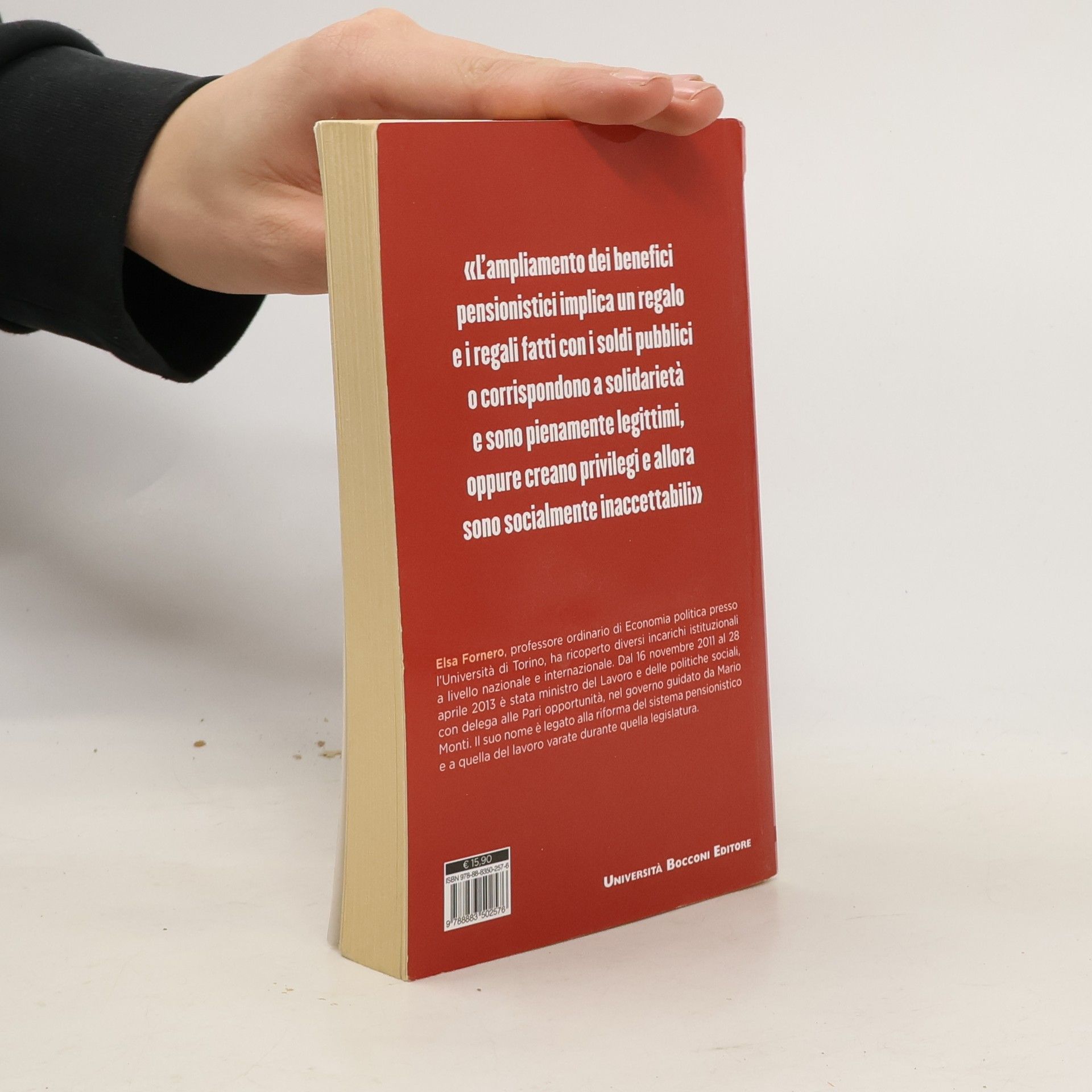 «L’ampliamento dei benefici pensionistici implica un regalo e i regali fatti con i soldi pubblici o corrispondono a solidarietà e sono pienamente legittimi, oppure creano privilegi e allora sono socialmente inaccettabili.» Elsa Fornero, professore ordinario di Economia politica presso l’Università di Torino, ha ricoperto diversi incarichi istituzionali a livello nazionale e internazionale. Dal 16 novembre 2011 al 28 aprile 2013 è stata ministro del Lavoro e delle politiche sociali, con delega alle Pari opportunità, nel governo guidato da Mario Monti. Il suo nome è legato alla riforma del sistema pensionistico e a quella del lavoro varate durante quella legislatura.