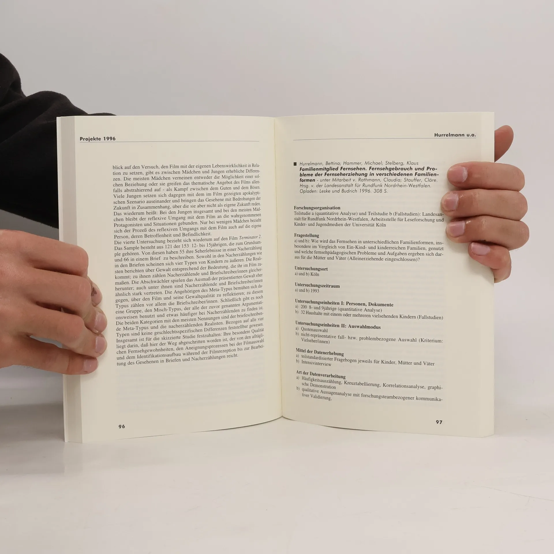 In diesem Band werden Forschungsprojekte und -ergebnisse skizziert, die im Zeitraum von 1989 bis (Ende) 1999 veröffentlicht worden sind. Die vorgestellten empirischen Projekte sind Primäranalysen; sie werden im Hinblick auf ihre Untersuchungsanlage wie auf die praktizierte Datenerhebung und die Datenauswertung beschrieben. Entscheidendes Kriterium für die Projekteauswahl ist, daß die Untersuchungen Auswertungen und Interpretationen von Daten enthalten, die von den Autor/innen selbst, in ihrer Regie oder unter ihrer Mitwirkung (z. B. im Rahmen eines Befragungsinstituts oder einer Forschungskommission) erhoben worden sind. Die Projekte beziehen sich schwergewichtig, hin und wieder auch medienvergleichend, auf das Thema Kinder und Fernsehen in Deutschland. Ihre Zielgruppe sind die 3- bis 13jährigen, einschließlich solcher Alterssegmente, die nur einen Teil dieser Kohorte enthalten (10- bis 15-, 12- bis 17jährige etc.). Edition TelevIZIon (hgg. vom Internationalen Zentralinstitut für das Jugend- und Bildungsfernsehen, München),