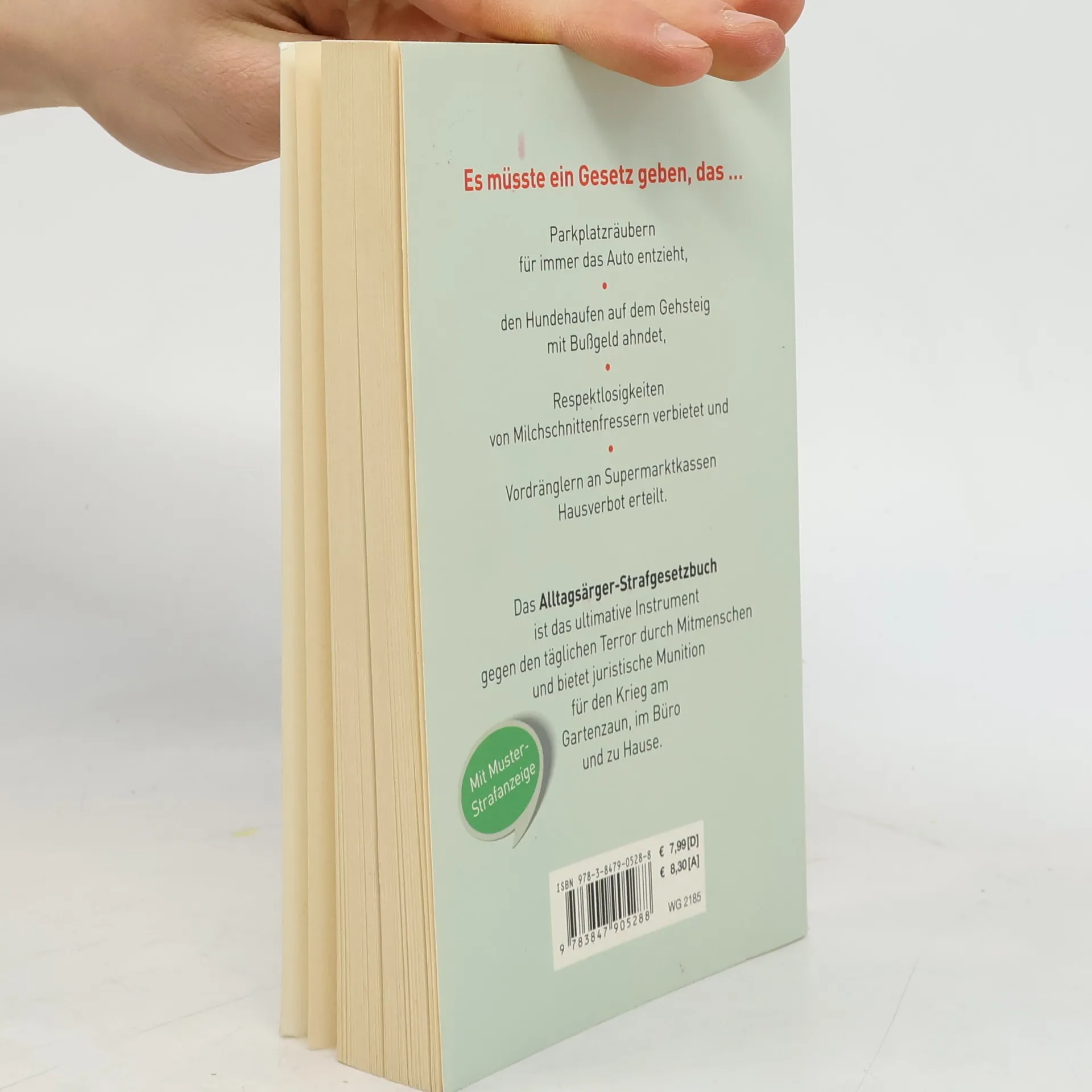 Parkplatzräubern für immer das Auto entzieht, den Hundehaufen auf dem Gehsteig mit Bußgeld ahndet, Respektlosigkeiten von Milchschnittenfressern verbietet und Vordränglern an Supermarktkassen Hausverbot erteilt. Das Alltagsärger-Strafgesetzbuch ist das ultimative Instrument gegen den täglichen Terror durch Mitmenschen und bietet juristische Munition für den Krieg am Gartenzaun, im Büro und zu Hause. Mit Muster-Strafanzeige