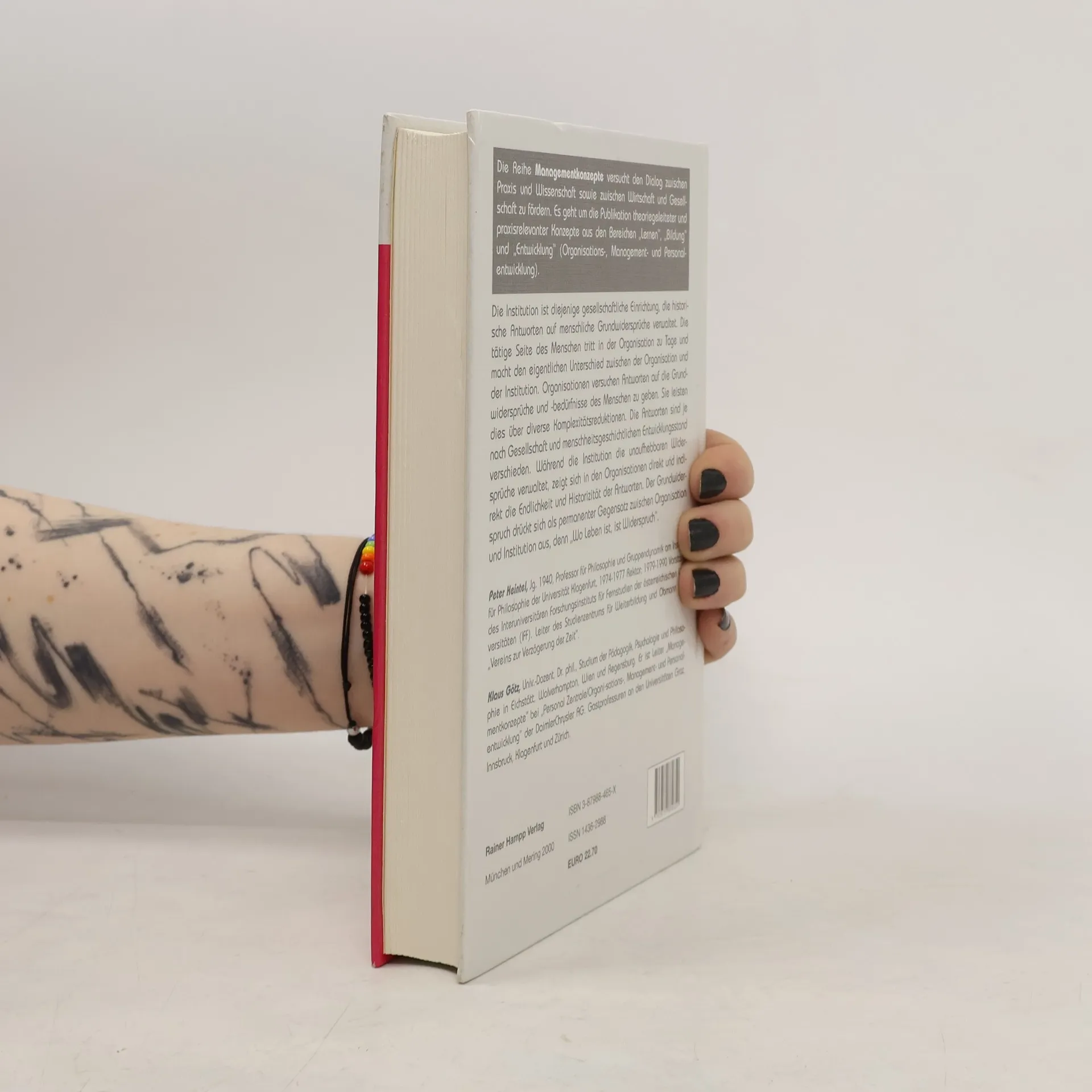 Die Institution verwaltet historische Antworten auf menschliche Grundwidersprüche und zeigt den Unterschied zwischen Organisation und Institution. Während Organisationen versuchen, diese Widersprüche und Bedürfnisse des Menschen zu adressieren, geschieht dies durch verschiedene Komplexitätsreduktionen. Die Antworten variieren je nach Gesellschaft und historischem Entwicklungsstand. Die Institution hingegen verwaltet die unaufhebbaren Widersprüche, während Organisationen die Endlichkeit und Historizität ihrer Antworten offenbaren. Der Grundwiderspruch manifestiert sich als permanenter Gegensatz zwischen Organisation und Institution, denn „Wo Leben ist, ist Widerspruch“. Peter Heintel, Jahrgang 1940, ist Professor für Philosophie und Gruppendynamik an der Universität Klagenfurt und war von 1974 bis 1977 Rektor sowie von 1979 bis 1990 Vorstand des Interuniversitären Forschungsinstituts für Fernstudien. Klaus Götz, Jahrgang 1957, ist Universitätsdozent und hat in Pädagogik, Psychologie und Philosophie studiert. Er leitet den Bereich „Managementkonzepte“ bei DaimlerChrysler AG und hat Gastprofessuren an mehreren Universitäten inne.