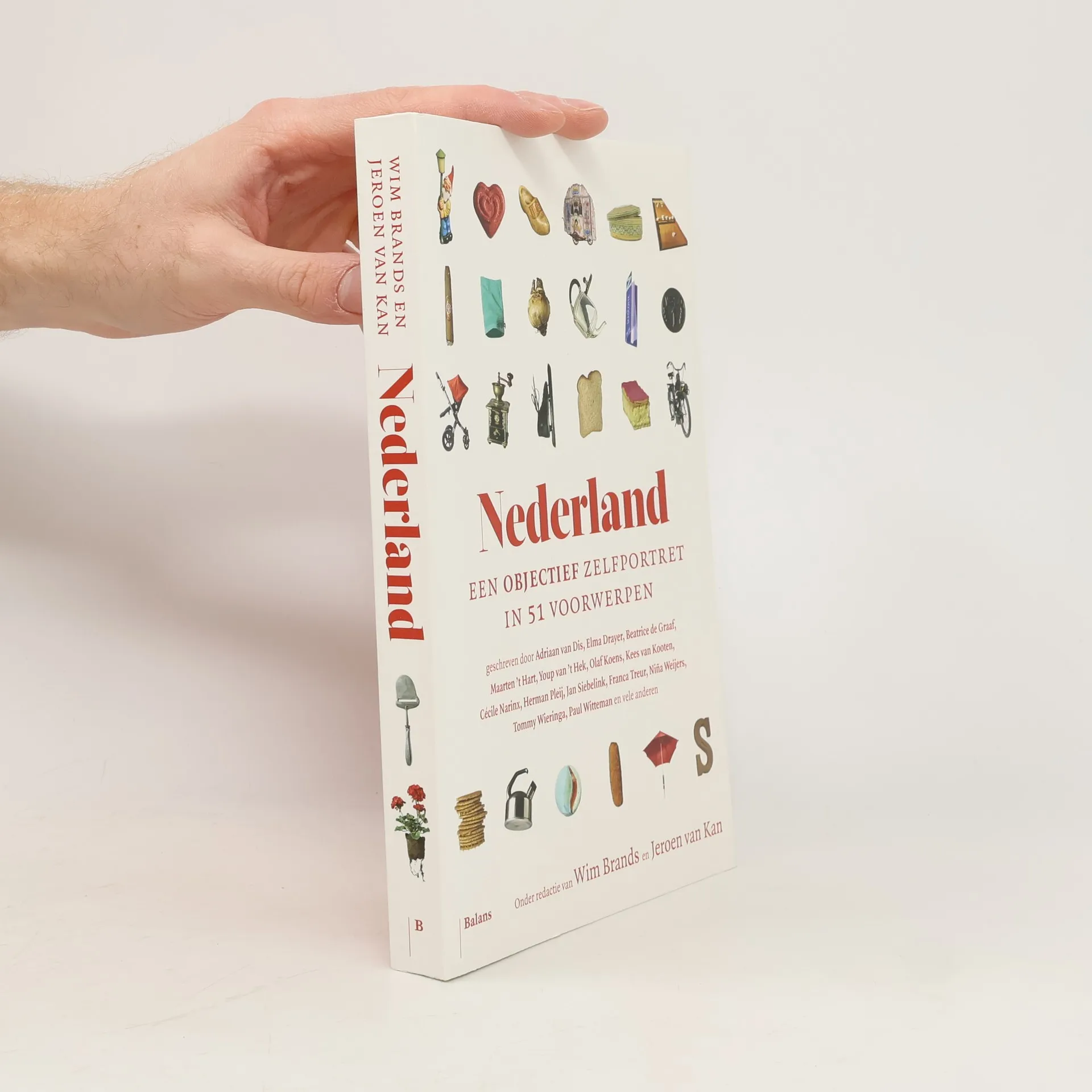Nederland. Een objectief zelfportret in 51 voorwerpen, druk 1, Wim Brands, Jeroen van Kan, Adriaan van Dis, Elma Drayer, Beatrice de Graaf, Maarten 't Hart, Youp van 't Hek, Olaf Koens, Kees Van Kooten, Cécile Narinx, Herman Pleij, Jan Siebelink, Franca Treur, Niña Weijers, Tommy Wieringa, Paul Witteman, Wim Noordhoek, Mano Bouzamour