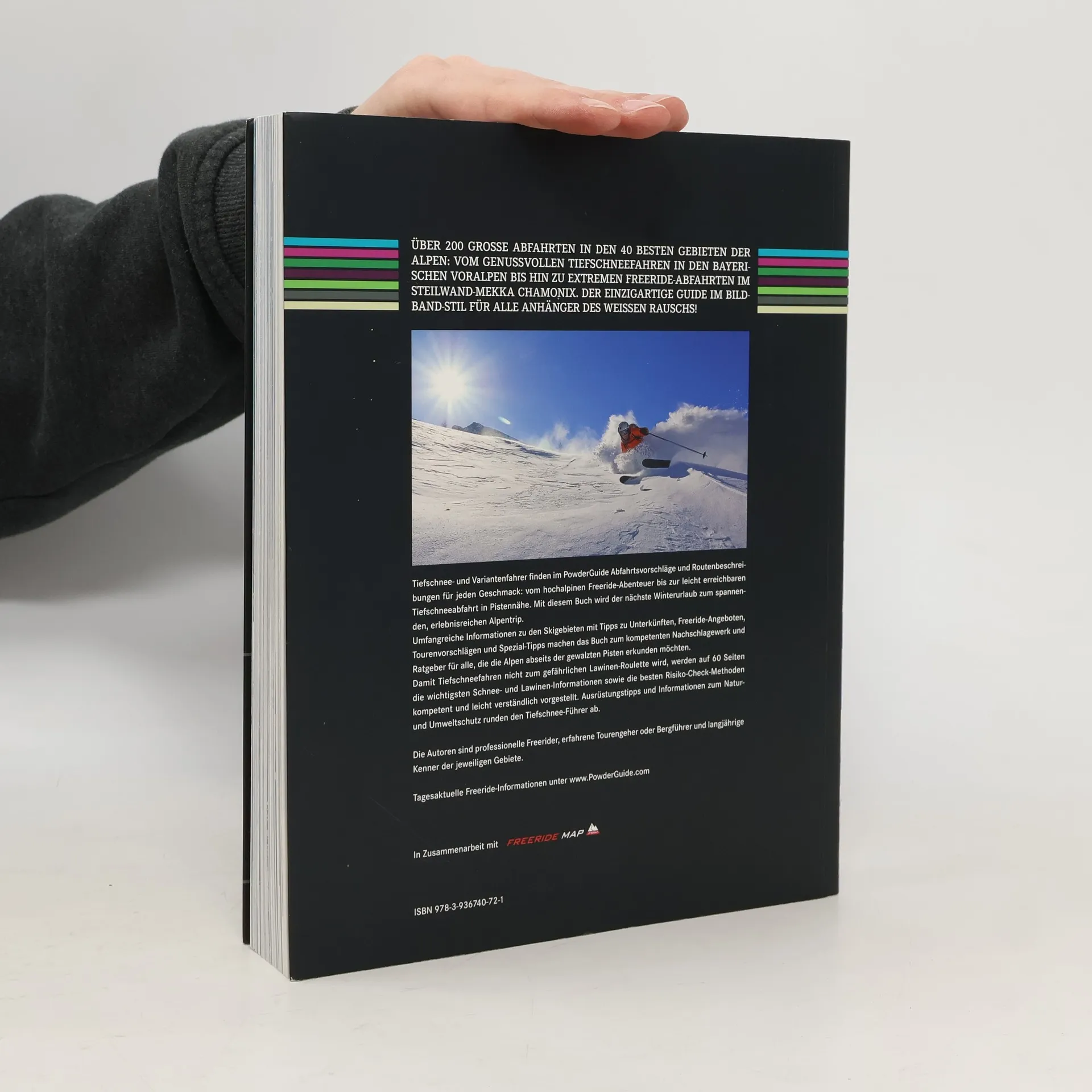 Das Powderguide Team hat mit diesem prächtigen Bildband wirkliches Neuland befahren: Tiefschnee und Variantenfahrer finden hier fantastische Routenvorschläge in 40 der besten Freeride Gebiete der Alpen. Umfangreiche Informationen zu den Orten mit Tipps zu Unterkünften, Freeride Angeboten und detaillierten Karten bieten mehr als nur Stoff zum Träumen. Als Bonus vermittelt der Powderguide auf 70 informativen Seiten das wichtigste Schnee- und Lawinen-Know-How kompetent und kurzweilig. Damit nichts dem Zufall überlassen wird, erklären die Autoren verständlich aktuelle Risiko-Check-Methoden und liefern wichtige Ausrüstungstipps. Fundierte Informationen zum Natur- und Umweltschutz beim Fahren abseits der Piste runden den Powderguide ab. Kurzum: der Powderguide ist ein ultimatives Nachschlagewerk und kompetenter Ratgeber für alle, die die Alpen abseits der gewalzten Pisten erkunden wollen.