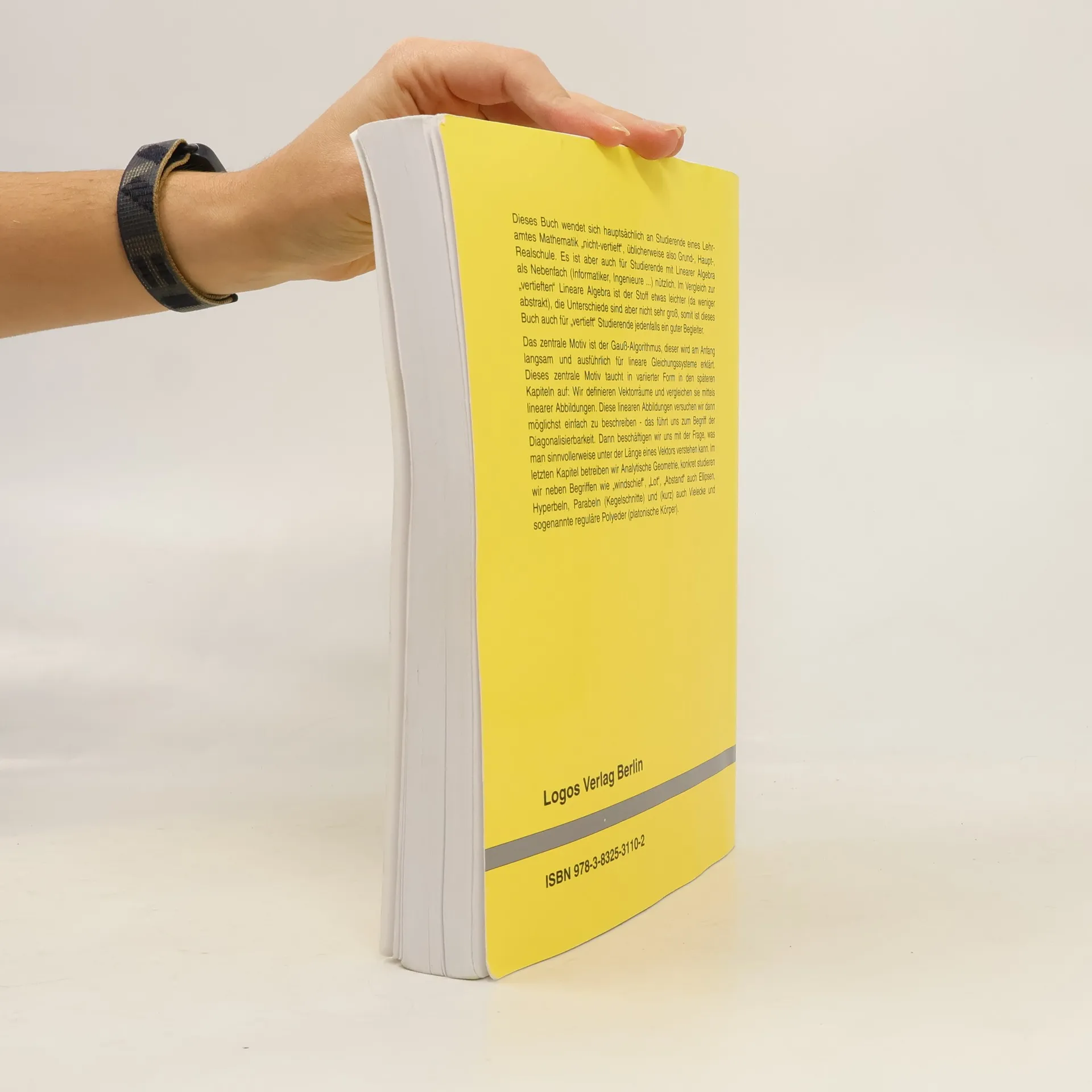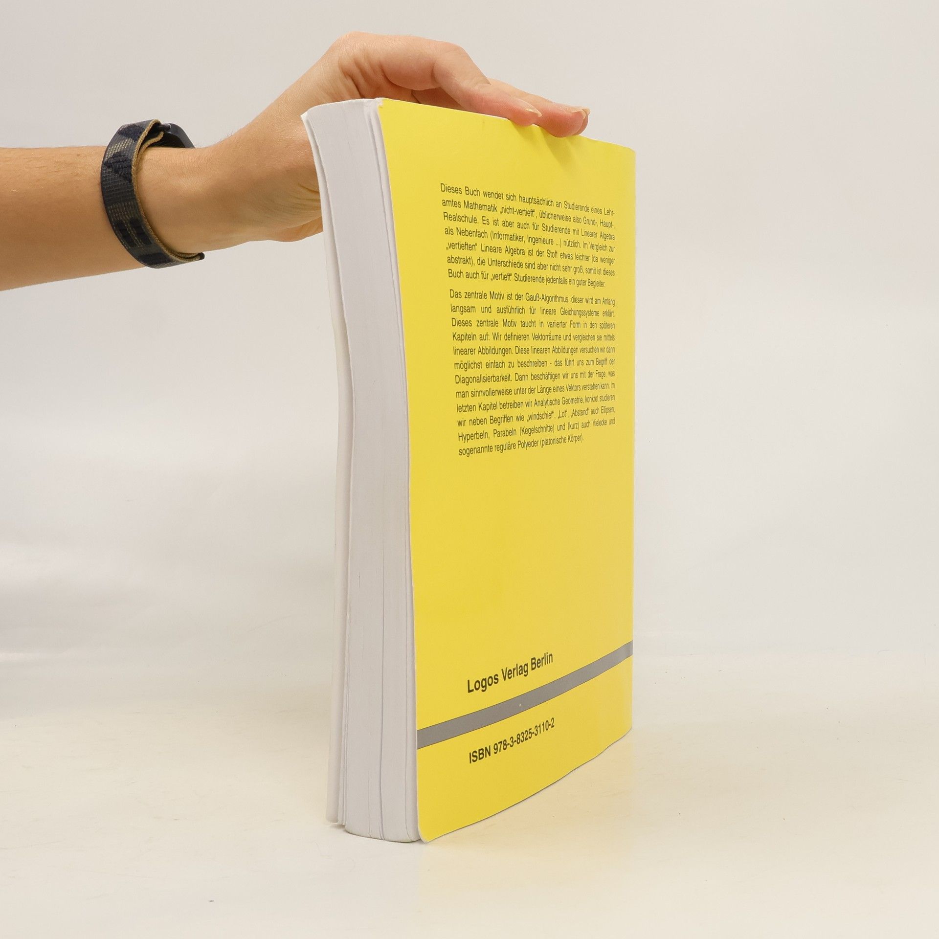 Dieses Buch wendet sich hauptsachlich an Studierende eines Lehramtes Mathematik "nicht-vertieft," ublicherweise also Grund-, Haupt-, Realschule. Es ist aber auch fur Studierende mit Linearer Algebra als Nebenfach (Informatiker, Ingenieure ...) nutzlich. Im Vergleich zur "vertieften" Lineare Algebra ist der Stoff etwas leichter (da weniger abstrakt), die Unterschiede sind aber nicht sehr gross, somit ist dieses Buch auch fur "vertieft" Studierende jedenfalls ein guter Begleiter. Das zentrale Motiv ist der Gauss-Algorithmus, dieser wird am Anfang langsam und ausfuhrlich fur lineare Gleichungssysteme erklart. Dieses zentrale Motiv taucht in variierter Form in den spateren Kapiteln Wir definieren Vektorraume und vergleichen sie mittels linearer Abbildungen. Diese linearen Abbildungen versuchen wir dann moglichst einfach zu beschreiben - das fuhrt uns zum Begriff der Diagonalisierbarkeit. Dann beschaftigen wir uns mit der Frage, was man sinnvollerweise unter der Lange eines Vektors verstehen kann. Im letzten Kapitel betreiben wir Analytische Geometrie, konkret studieren wir neben Begriffen wie "windschief," "Lot," "Abstand" auch Ellipsen, Hyperbeln, Parabeln (Kegelschnitte) und (kurz) auch Vielecke und sogenannte regulare Polyeder (platonische Korper).