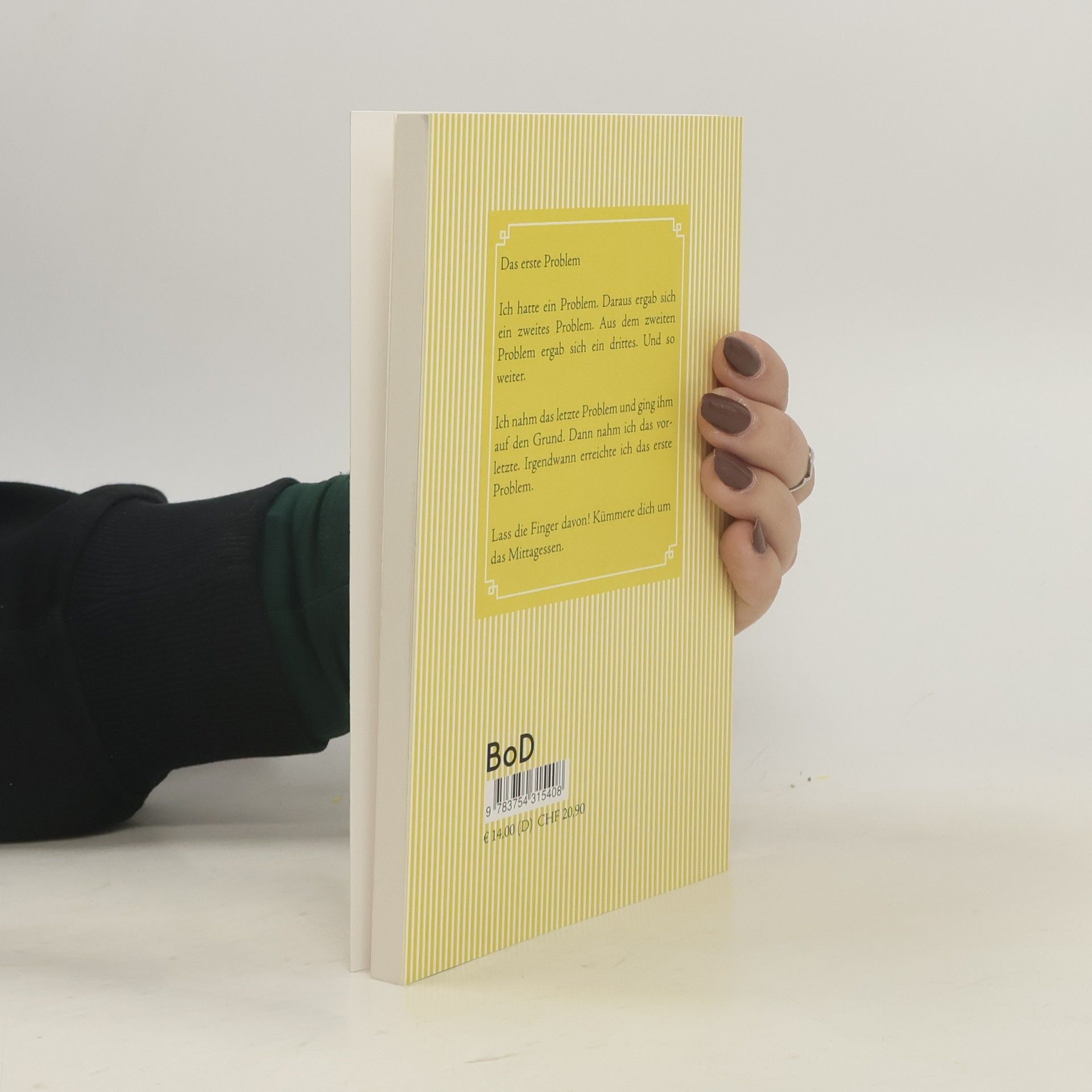 Das erste Problem Ich hatte ein Problem. Daraus ergab sich ein zweites Problem. Aus dem zweiten Problem ergab sich ein drittes. Und so weiter. Ich nahm das letzte Problem und ging ihm auf den Grund. Dann nahm ich das vorletzte. Irgendwann erreichte ich das erste Problem. Lass die Finger davon! Kümmere dich um das Mittagessen.