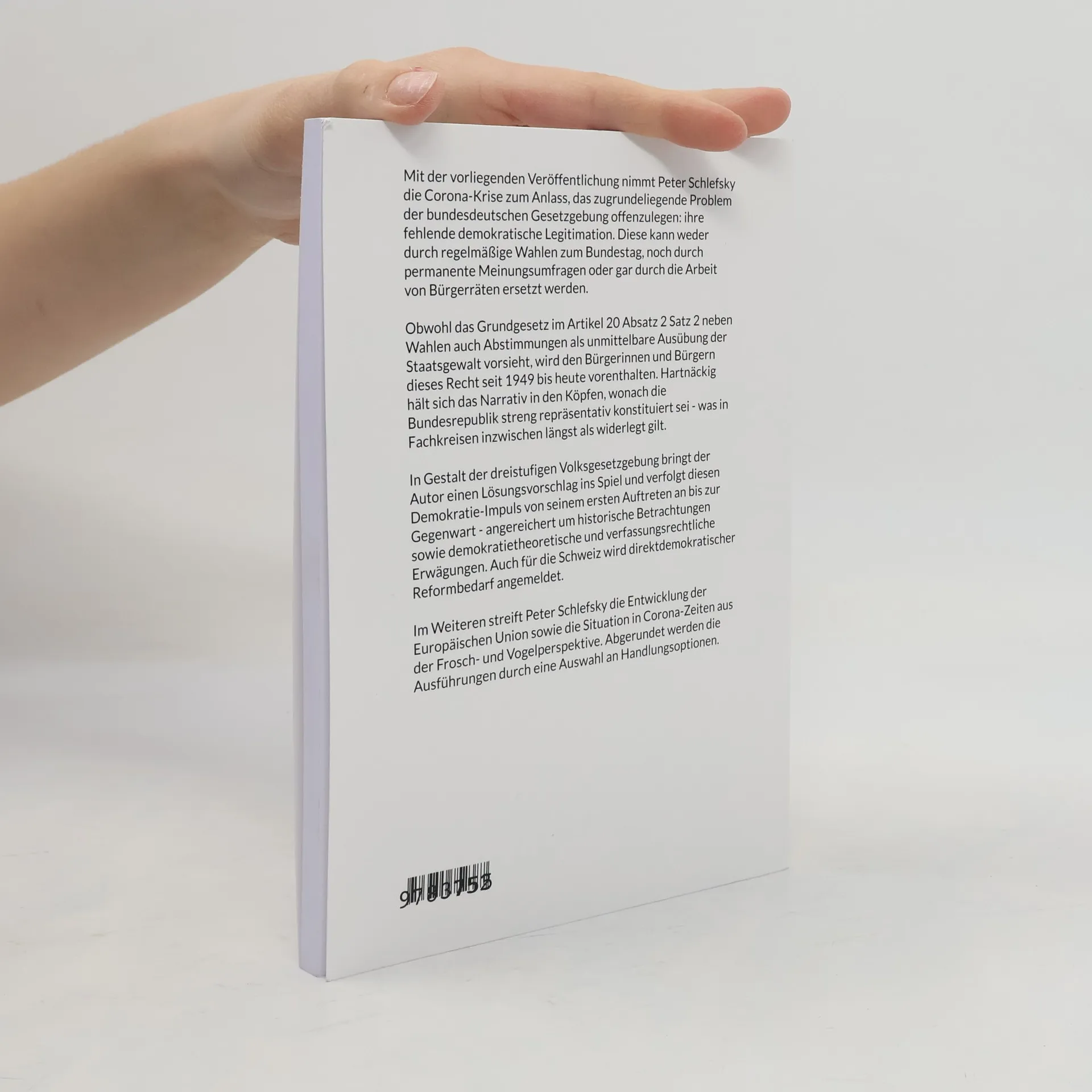 Mit der vorliegenden Veröffentlichung nimmt Peter Schlefsky die Corona-Krise zum Anlass, das zugrundeliegende Problem der bundesdeutschen Gesetzgebung ihre fehlende demokratische Legitimation. Diese kann weder durch regelmäßige Wahlen zum Bundestag, noch durch permanente Meinungsumfragen oder gar durch die Arbeit von Bürgerräten ersetzt werden. Obwohl das Grundgesetz im Artikel 20 Absatz 2 Satz 2 neben Wahlen auch Abstimmungen als unmittelbare Ausübung der Staatsgewalt vorsieht, wird den Bürgerinnen und Bürgern dieses Recht seit 1949 bis heute vorenthalten. Hartnäckig hält sich das Narrativ in den Köpfen, wonach die Bundesrepublik streng repräsentativ konstituiert sei - was in Fachkreisen inzwischen längst als widerlegt gilt. In Gestalt der dreistufigen Volksgesetzgebung bringt der Autor einen Lösungsvorschlag ins Spiel und verfolgt diesen Demokratie-Impuls von seinem ersten Auftreten an bis zur Gegenwart - angereichert um historische Betrachtungen sowie demokratietheoretische und verfassungsrechtliche Erwägungen. Auch für die Schweiz wird direktdemokratischer Reformbedarf angemeldet. Im Weiteren streift Peter Schlefsky die Entwicklung der Europäischen Union sowie die Situation in Corona-Zeiten aus der Frosch- und Vogelperspektive. Abgerundet werden die Ausführungen durch eine Auswahl an Handlungsoptionen.