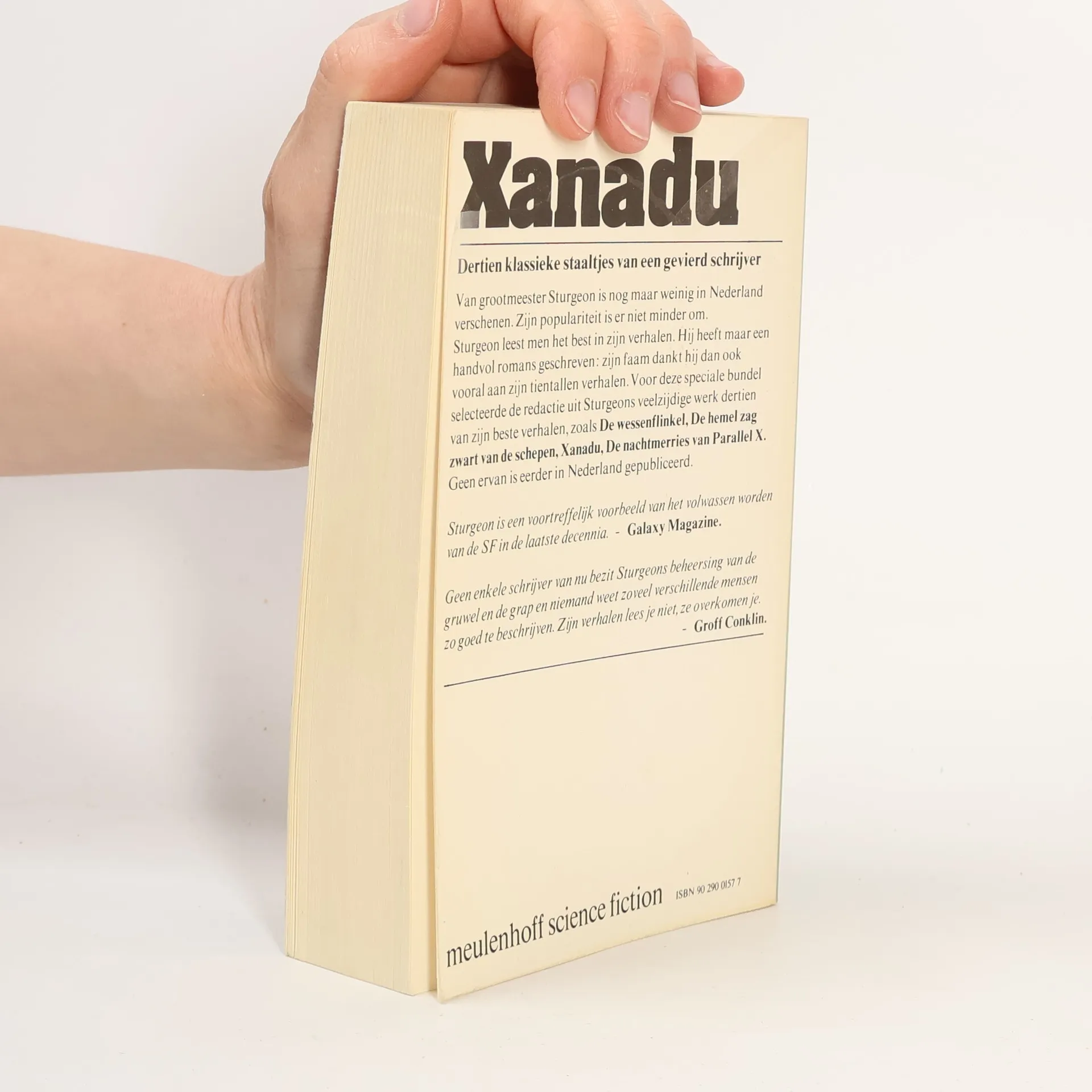 Een door uitgeverij Meulenhoff samengestelde verzameling verhalen uit het oeuvre van Theodore Sturgeon.Bevat:Xanadu (Orig. The skills od Xanadu)Het gedenkteken (Orig. Memorial)De wessenflinkel (Orig. Shottle bop)Op het scherp van het ontleedmes (Orig. Occam's scalpel)Meneer Costello, held (Orig. Mr. Costello, hero)Begaafd (Orig. Talent)De hemel zag zwart van de schepen (Orig. The sky was full of ships)Donder en rozen (Orig. Thunder and roses)De nachtmerries van parallel X (Orig. The incubi of Parallel X)De hurkel is een gelukkig dier (Orig. The hurkle is a happy beast)De teddybeer van de professor (Orig. The professor's Teddy-Bear)Er bestaat geen afweer (Orig. There is no defense)Jong geleerd (Orig. Like young)