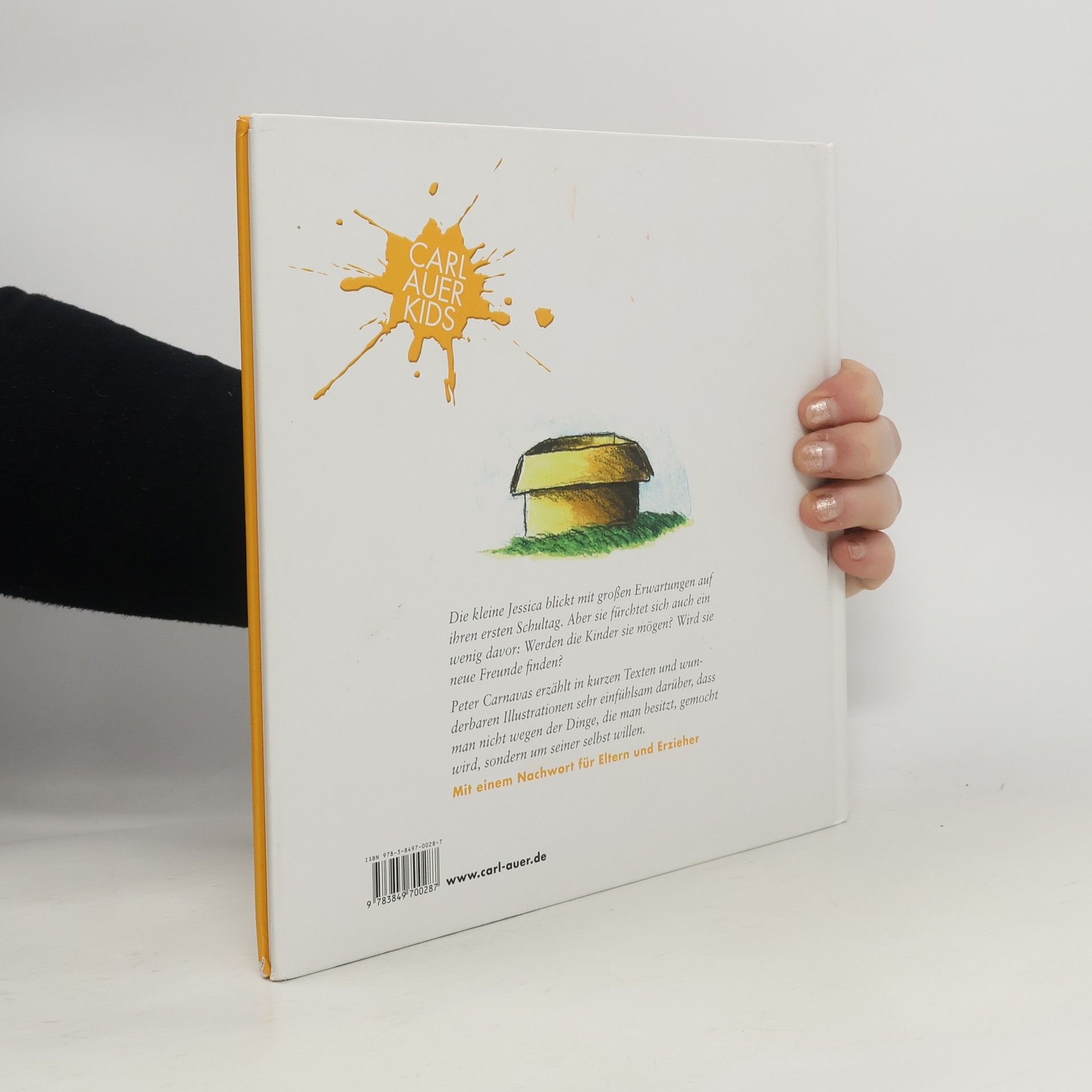 Die kleine Jessica blickt mit großen Erwartungen auf ihren ersten Schultag. Aber sie fürchtet sich auch ein wenig davor: Werden die Kinder sie mögen? Wird sie neue Freunde finden? Sie überlegt sich, wie sie das am besten anstellen könnte – und findet die Lösung in einer großen Schachtel, in die sie alles reinpackt, was sie den anderen Kindern zeigen möchte: ihren Lieblingsteddy, Muffins, ihren Hund … Aber alle Versuche, mit diesen Dingen, die Aufmerksamkeit der Kinder zu erwecken, scheitern. Mutlos und traurig verkriecht sie sich schließlich selbst in dem großen Karton – und wird gefunden! Ein Junge will mit ihr Versteck spielen und ihr Freund sein. Mit Jessicas Box erzählt Peter Carnavas in kurzen Texten und wunderbaren Illustrationen sehr einfühlsam darüber, dass man nicht wegen der Dinge, die man besitzt, gemocht wird, sondern um seiner selbst willen.