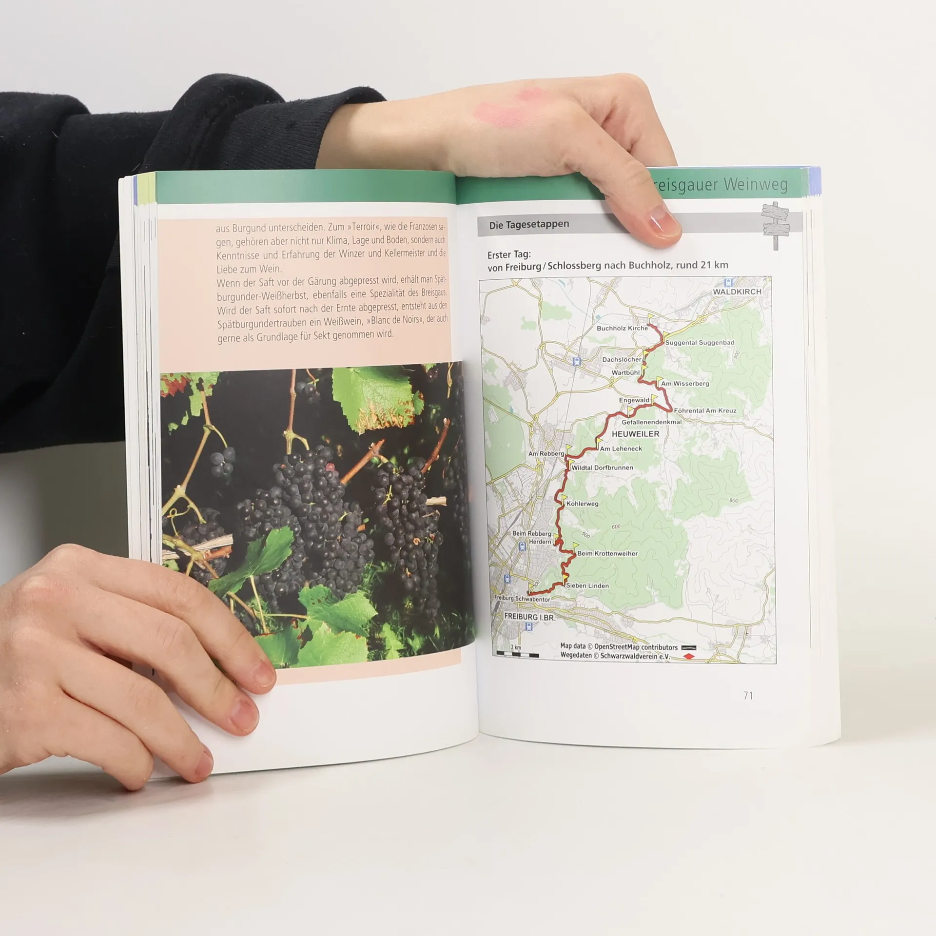 Wein und Wandern ist eine ideale Kombination für Genießer und Naturfreunde. Die drei Fernwanderwege des Schwarzwaldvereins – das Markgräfler Wiiwegli, der Breisgauer Weinweg und der Ortenauer Weinpfad – laden dazu ein. Sie führen auf zusammen 288 km in 15 Tagesetappen von Basel nach Baden-Baden. Die einzelnen Tagestouren sind zwischen 14 und 24 km lang. Streckenkarte und Wegbeschreibung liefern die erforderlichen Informationen. Wissenswertes über die drei durchwanderten Weinbauregionen, über die typischen Rebsorten, Hinweise zur Geschichte sowie Kultur und lustige Anekdoten machen das Buch zu mehr als nur zu einem Wanderführer. Es verlockt zu einem bisher noch viel zu wenig bekannten Wandererlebnis.
