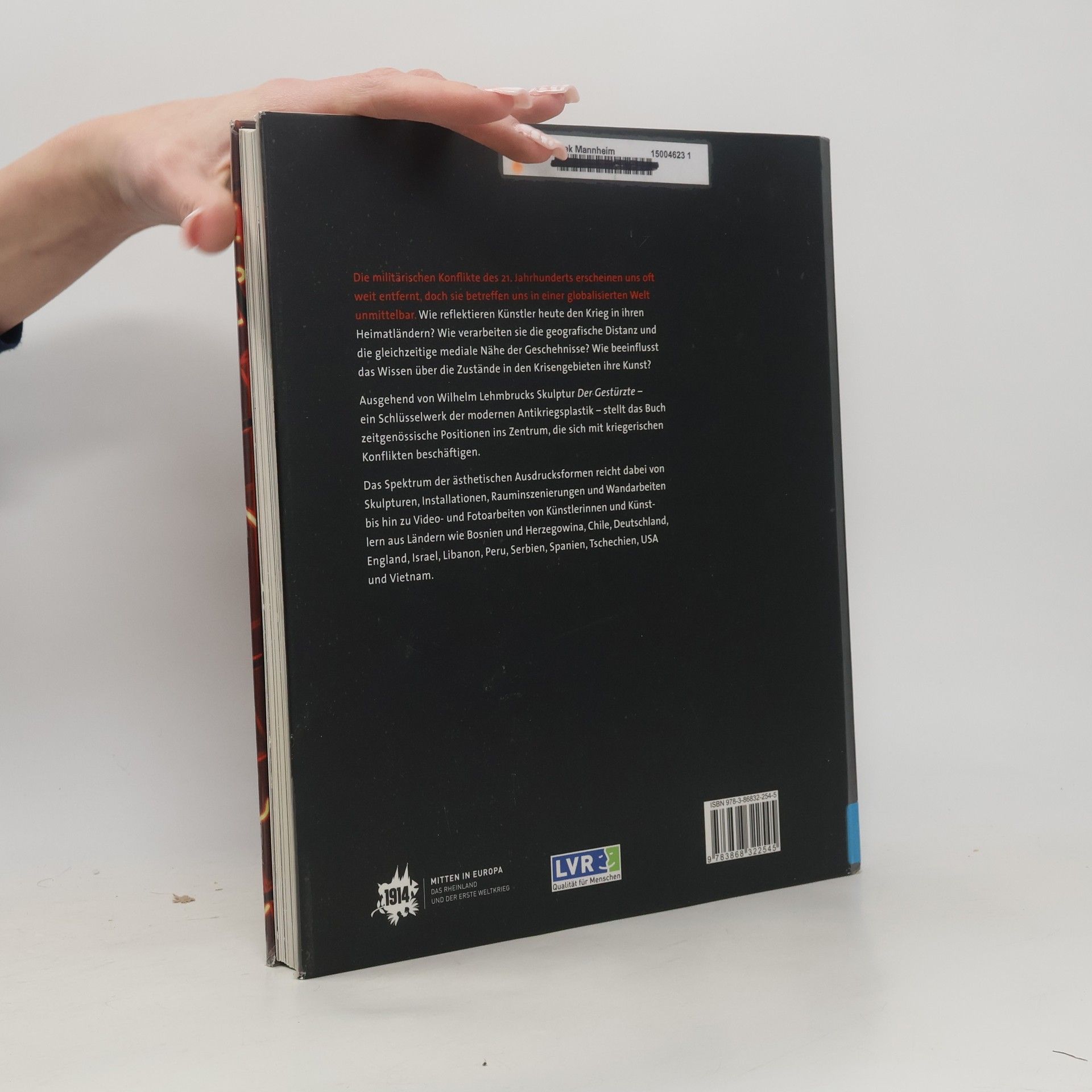 Wie reflektieren Künstler den Krieg in ihren Heimatländern? Wie verarbeiten sie die geografische Distanz und die gleichzeitige mediale Nähe der Geschehnisse? Wie beeinflusst das Wissen über die Zustände in den Krisengebieten ihre Kunst? Ausgehend von Wilhelm Lehmbrucks Skulptur Der Gestürzte – ein Schlüsselwerk in der Rezeption des Ersten Weltkriegs – stellt das Buch zeitgenössische Positionen ins Zentrum, die sich gestalterisch und thematisch mit kriegerischen Konflikten beschäftigen. Das Spektrum der ästhetischen Ausdrucksformen reicht dabei von Skulpturen, Installationen, Rauminszenierungen und Wandarbeiten bis hin zu Video- und Fotoarbeiten von Künstlerinnen und Künstlern aus Ländern wie Chile, Bosnien und Herzegowina, Israel, Deutschland, Serbien, Spanien, Tschechien und Vietnam.00Exhibition: Lehmbruck Museum, Duisburg, Germany (11.9.-7.12.2014).