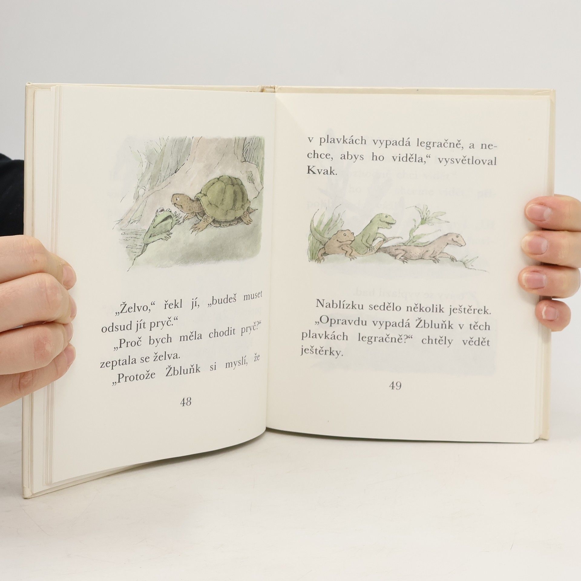 Úsměvné a hřejivé vyprávění o dvou kamarádech, zeleném žabákovi Kvakovi a hnědém ropušákovi Žbluňkovi potěšilo čtenáře nejen v zemi svého vzniku, ale i u nás (včetně dalších pokračování). Kdo by si tedy znovu rád nepřečetl o drobných příhodách a patáliích, které potkaly oba přátelé, když se na jaře probudili ze zimního spánku. Třeba právě o tom, jak hledali ztracený knoflík, jak se koupali v řece, jak pěstovali květiny či jak statečně utíkali před draky a obry. Prolínání fantazie s realitou umocňuje kouzlo této milé knížky, která je přímo stvořená pro začínající čtenáře.